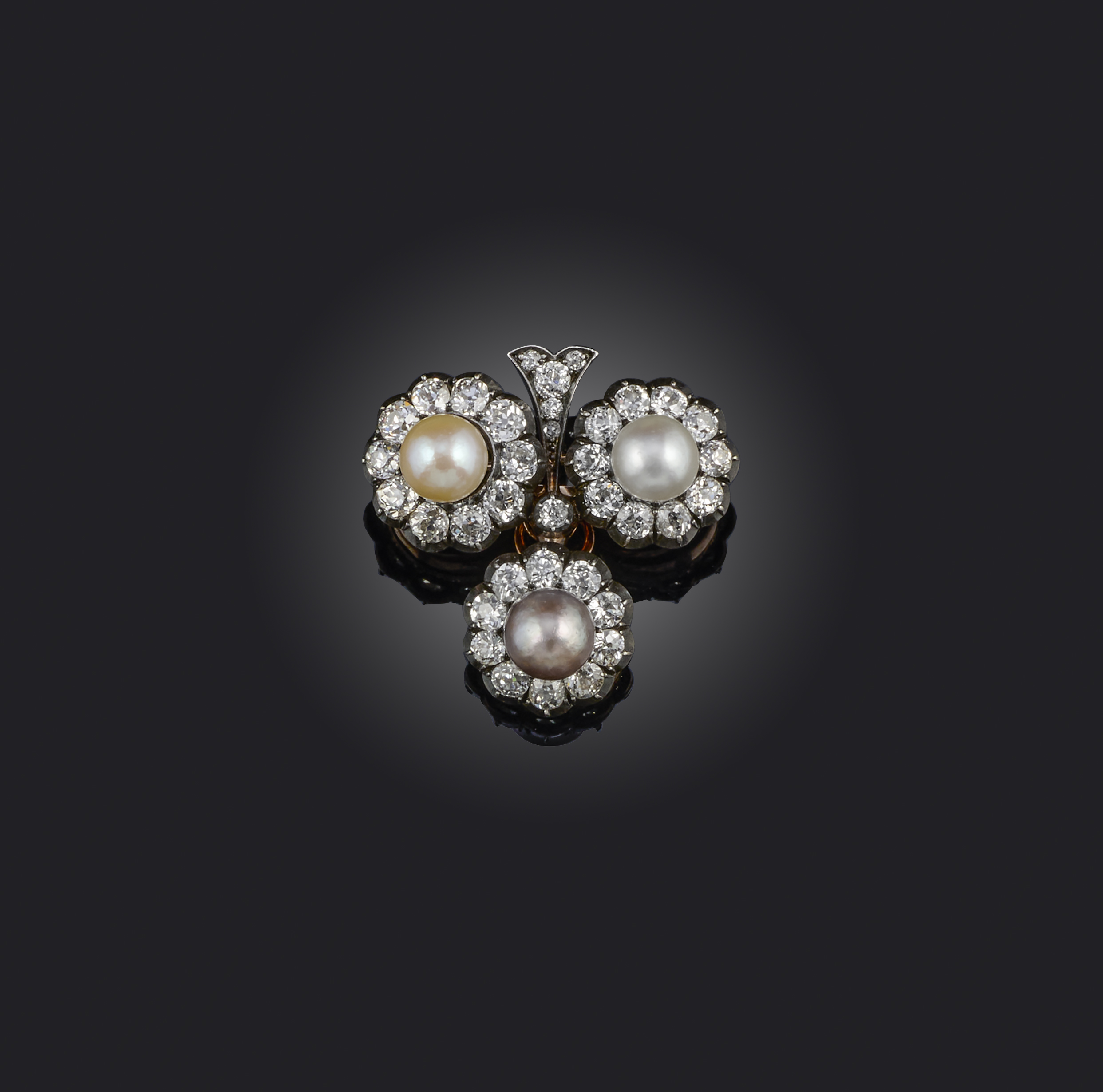 A natural pearl and diamond brooch, late 19th century, designed as a three-leaf clover, set with circular-cut diamonds and three natural pearls of white, cream and grey tints, measuring approximately 7.9 - 8.3mm diameter, mounted in silver and gold, length 3.4cm