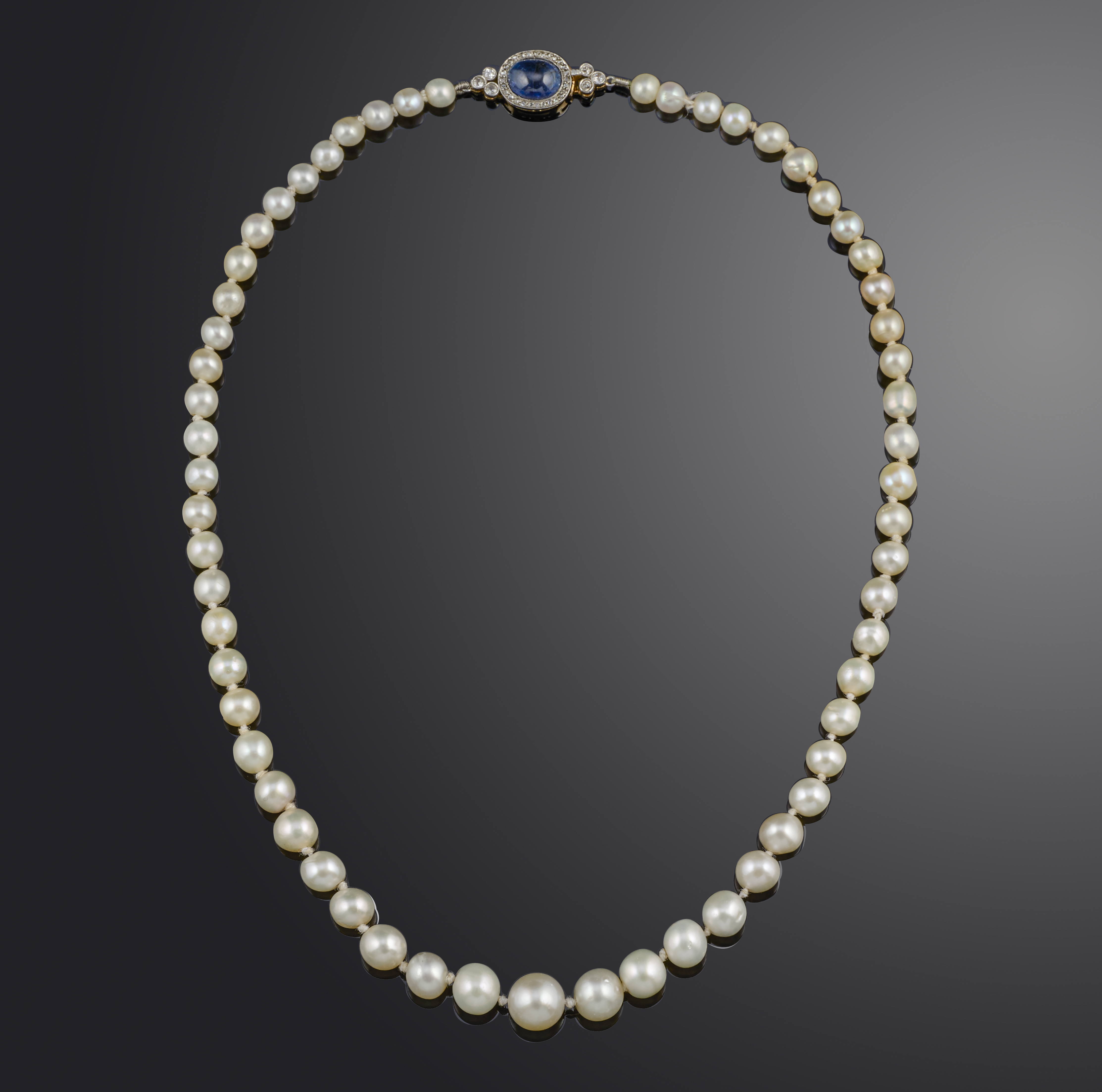 A natural pearl, sapphire and diamond necklace, early 20th century, designed as a single strand of