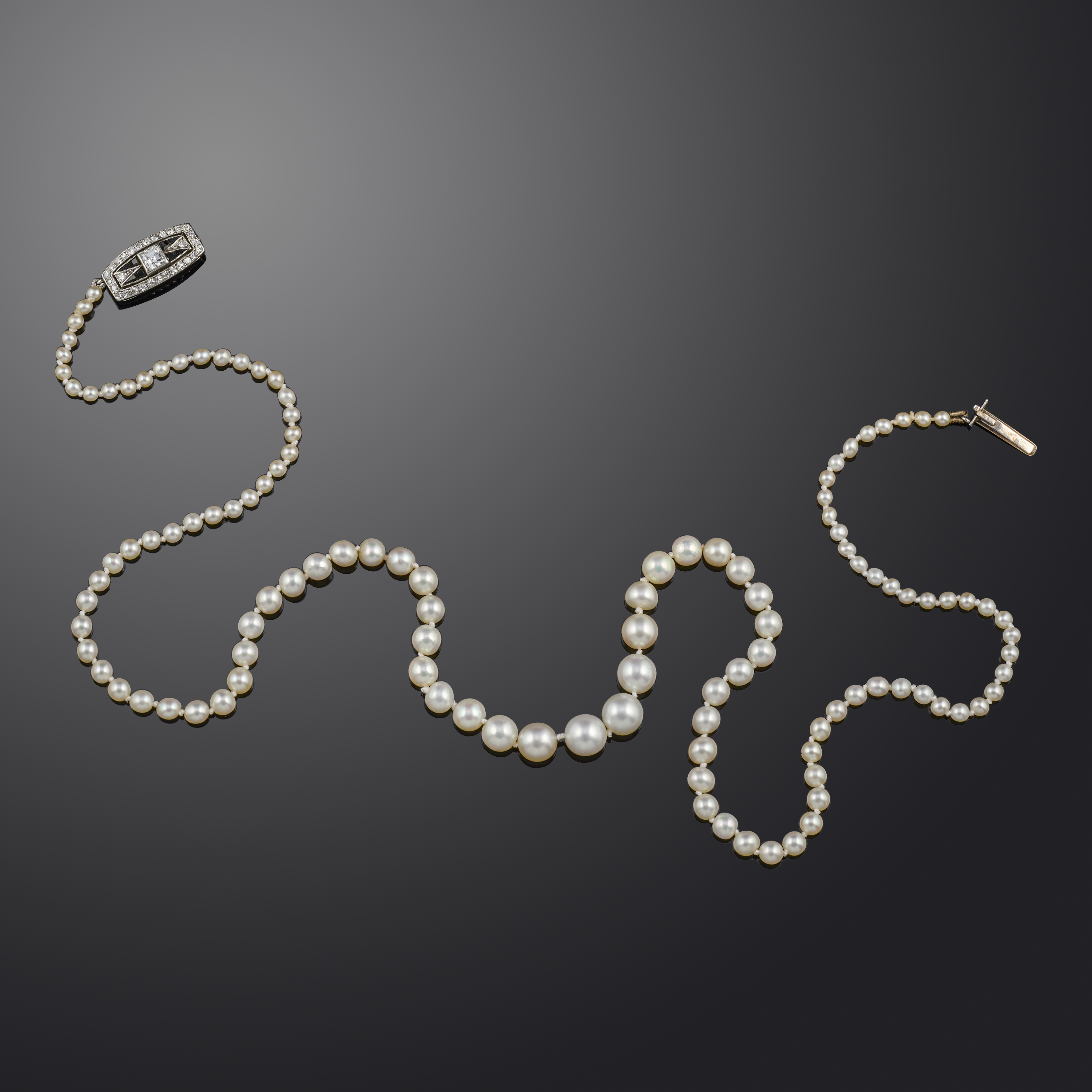 An Art Deco natural pearl, onyx and diamond necklace, early 20th century, composed of graduated natural pearls measuring approximately 2.5-7.0mm diameter, to a clasp of geometric design set with an Asscher-cut diamond, within a border of single-cut diamonds and calibré-cut onyx, length 52.5cm