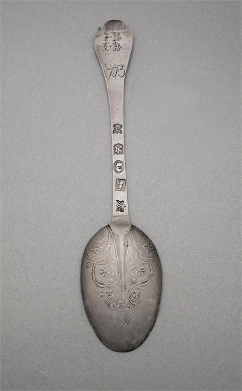 A William III spoon, pricked 'I.B' over 'I.B' above the engraved date 1724 and the script initials 'JB', maker Edward Sweet (of Crewkerne), Exeter 1701, 7.5in (19.1cm).