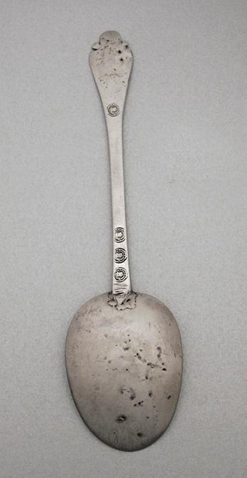 A Charles II spoon, scratched with a stylised foliate motif, maker unascribed (struck five times with a wheel like mark, centred with a fine petalled flower), probably West Country, c.1670-1680, repaired, 7.6in (19.3cm).