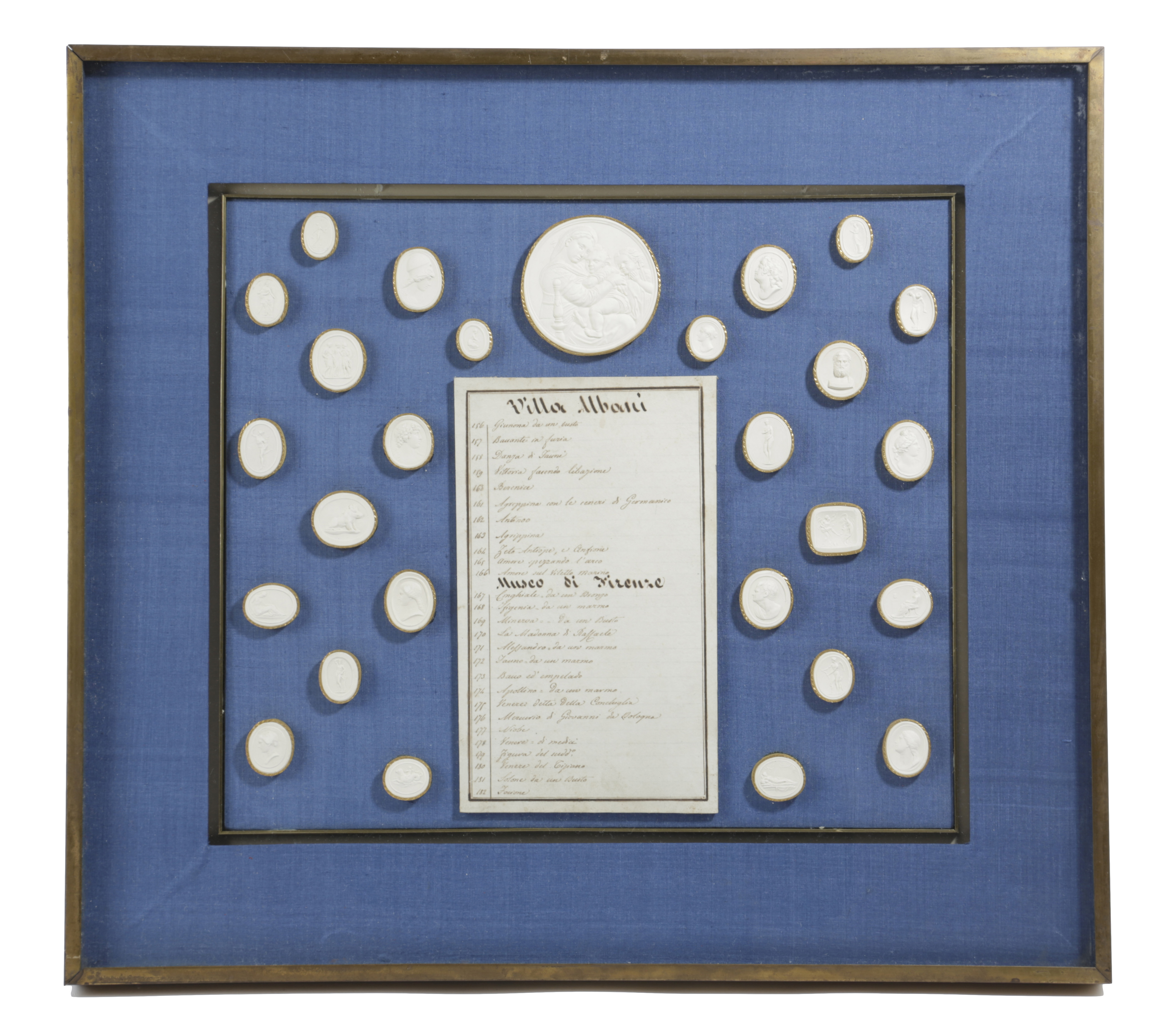 with original gilded paper frames, mounted around an inventory of the intaglios, numbered '156 to 182' from 'Villa Albani' and 'Museo di Firenze'