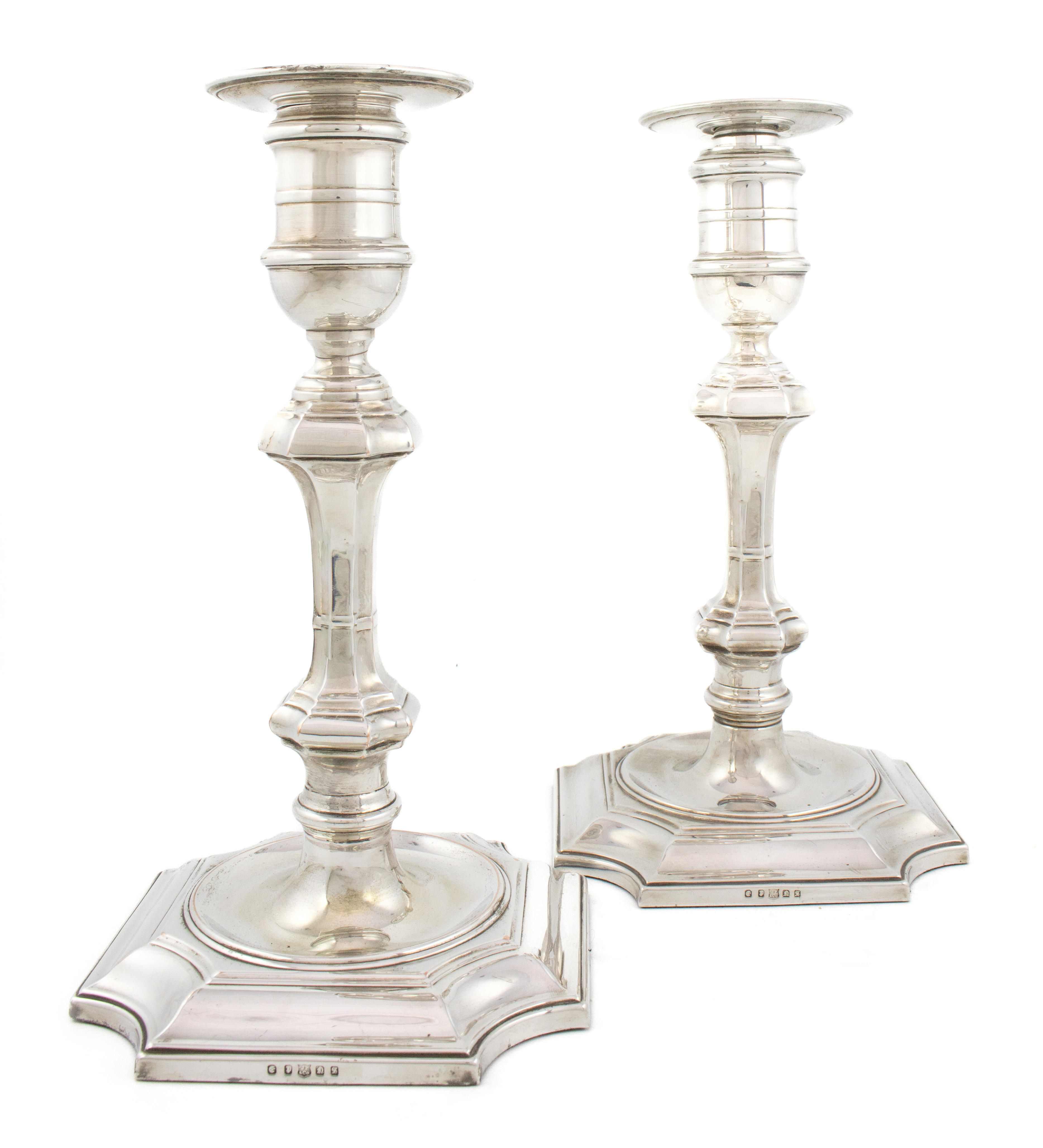 knopped baluster stems, spool-shaped capitals, one plain circular drip pan, on square bases with canted corners, height 33.6cm. (2)