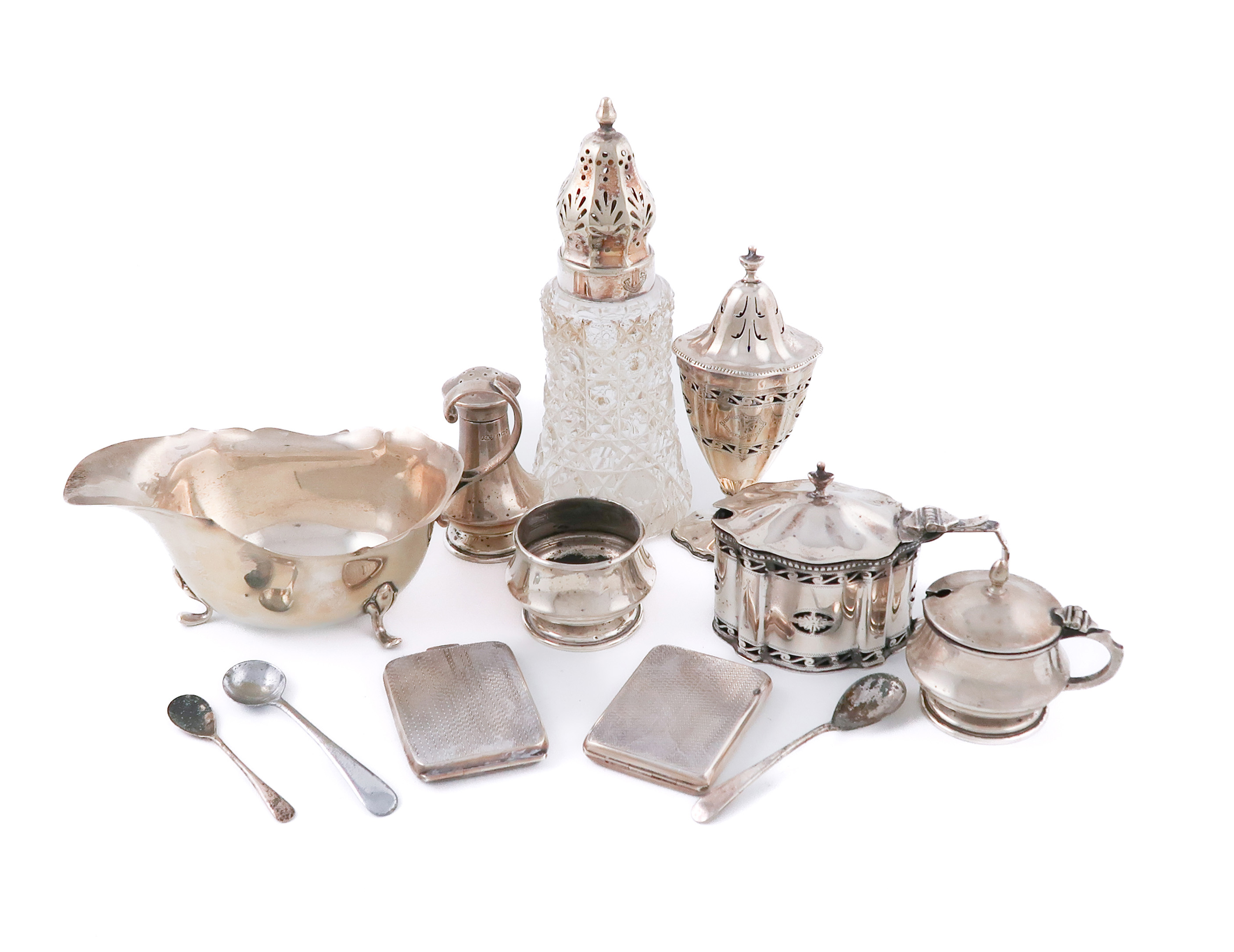 comprising: two vesta cases, two mustard pots, two pepper pots, a sugar caster, a sauce boat, a salt cellar with salt spoon and two condiment spoons, total approx. weighable 12.3oz. (12)