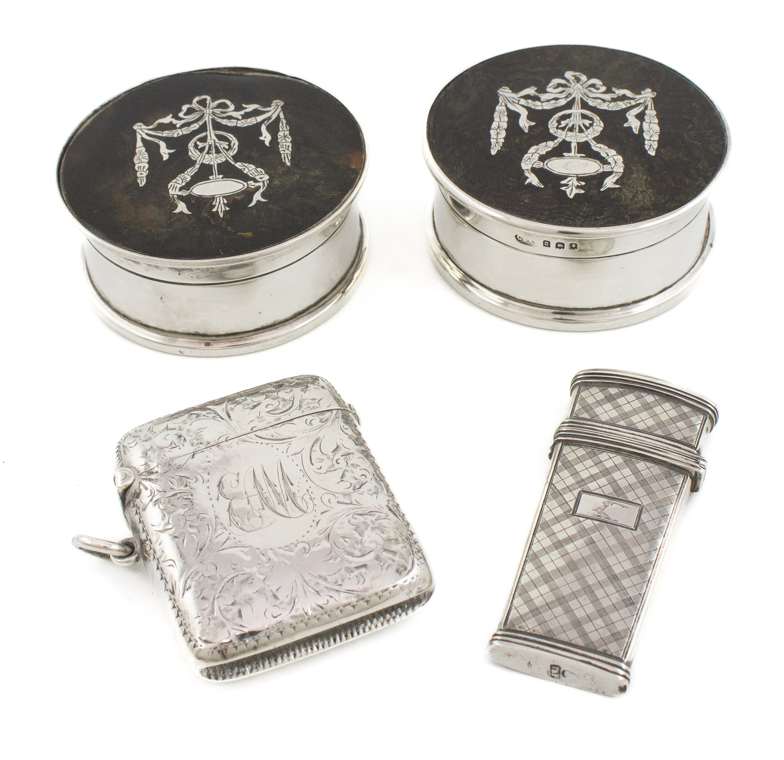 comprising: an early-19th century lancet case, by Taylor and Perry, Birmingham with tartan decoration, engraved with a crest and 'George Sheward', with two tortoiseshell lancets, plus a vesta case and two silver-mounted tortoiseshell boxes, of circular form, inlaid decoration. (4)