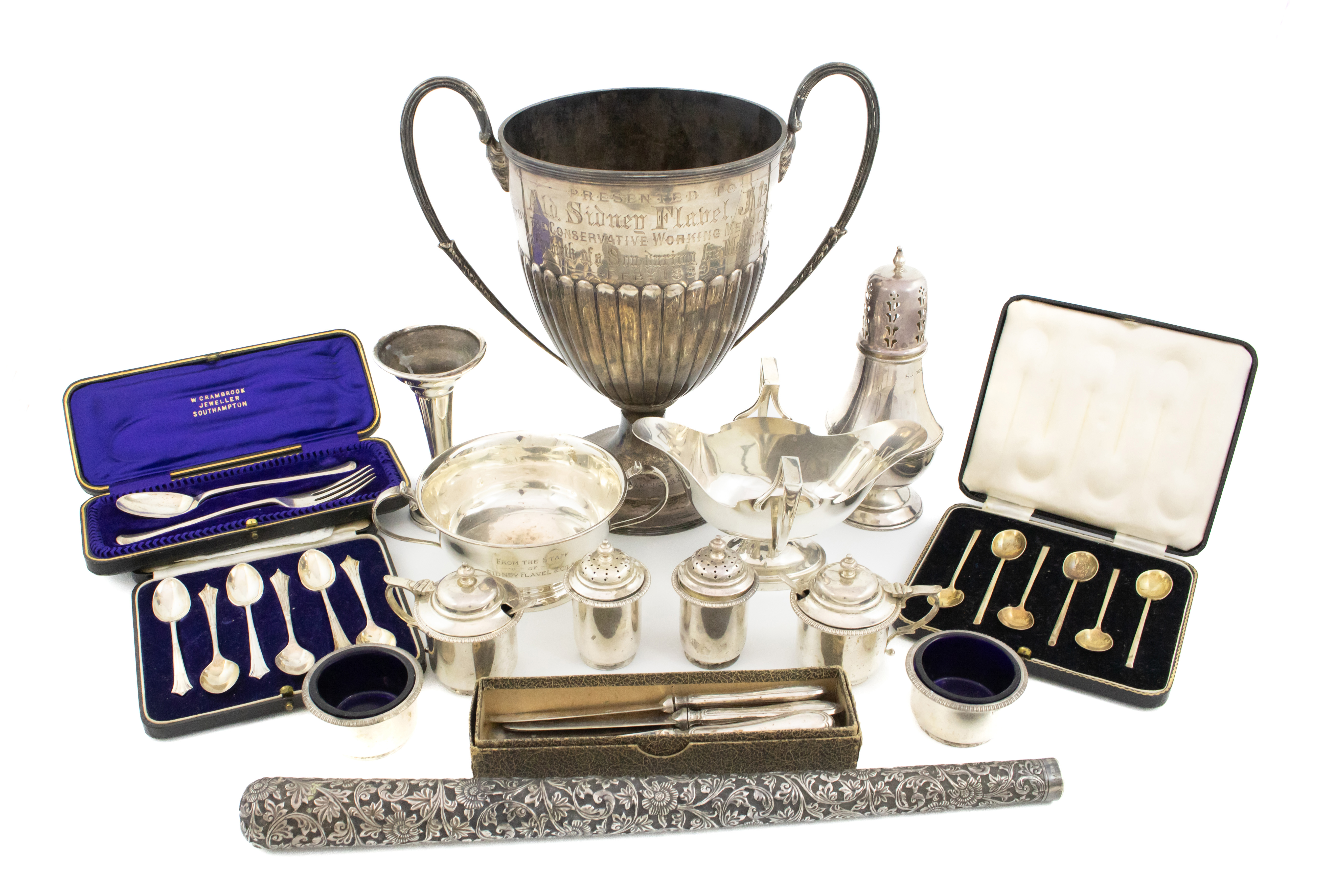 comprising: a two-handled trophy, a two-handled bowl, a sugar caster, a two-handled sauce boat, a pair of pepper pots, a pair of salt cellars, a pair of mustard pots, a parasol handle and other items, total approx. weighable 50.9oz. (qty)