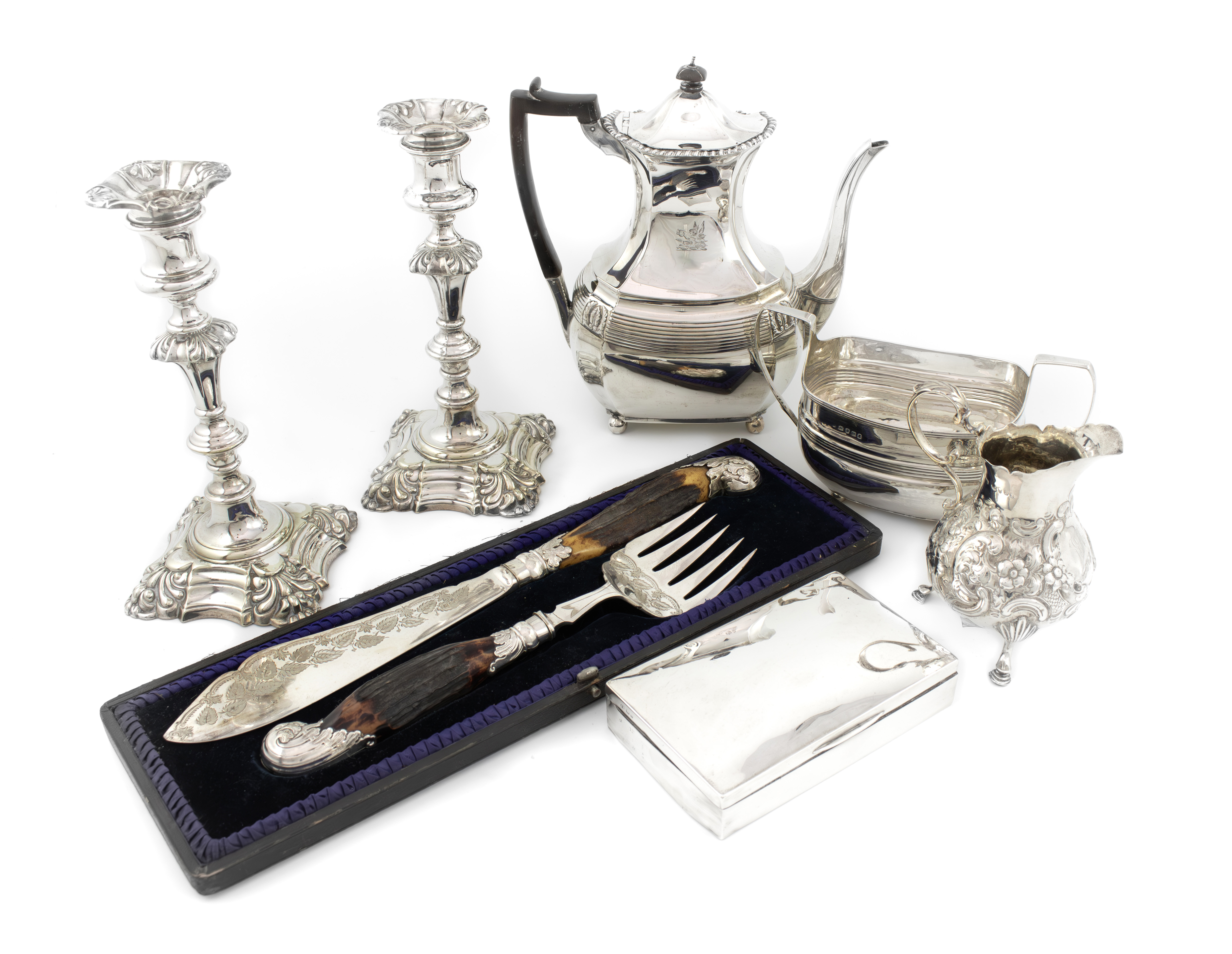 comprising silver items: a coffee pot, by The Barnards, London 1892, a George III sugar bowl, London 1807, a Victorian cream jug of baluster form, a cigarette box, plus a pair of electroplated candlesticks and a cased pair of fish servers with stag horn handles, approx. weighable 33oz. (7)