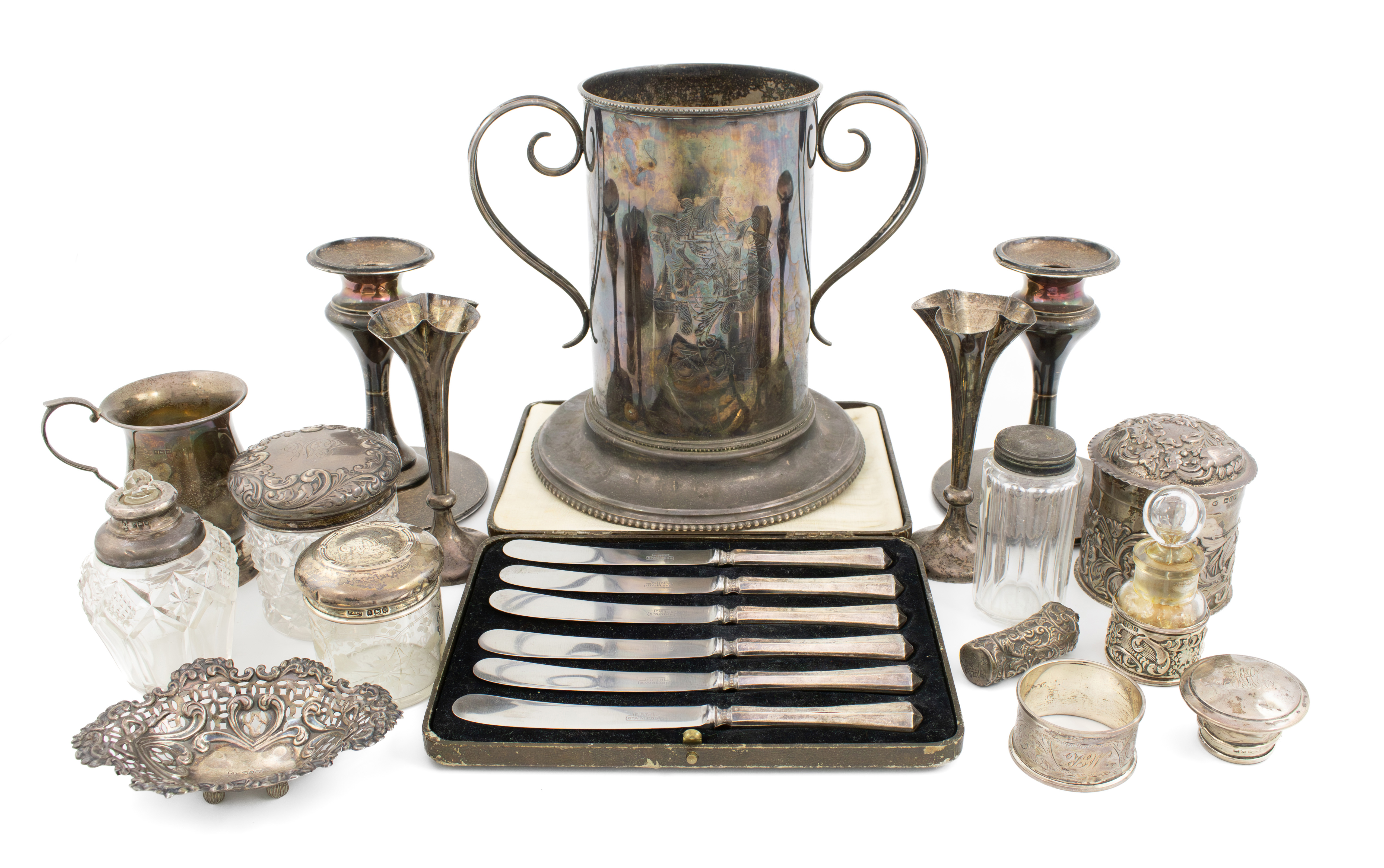 comprising: a pair of candlesticks, Birmingham 1901, a mug, a pair of vases, a dressing table pot, three silver-mounted glass dressing table jars, two scent bottles, a dish, six silver-handled cake knives, a napkin ring, a cane mount, and an electroplated siphon stand, approx. weighable 9oz. (qty)