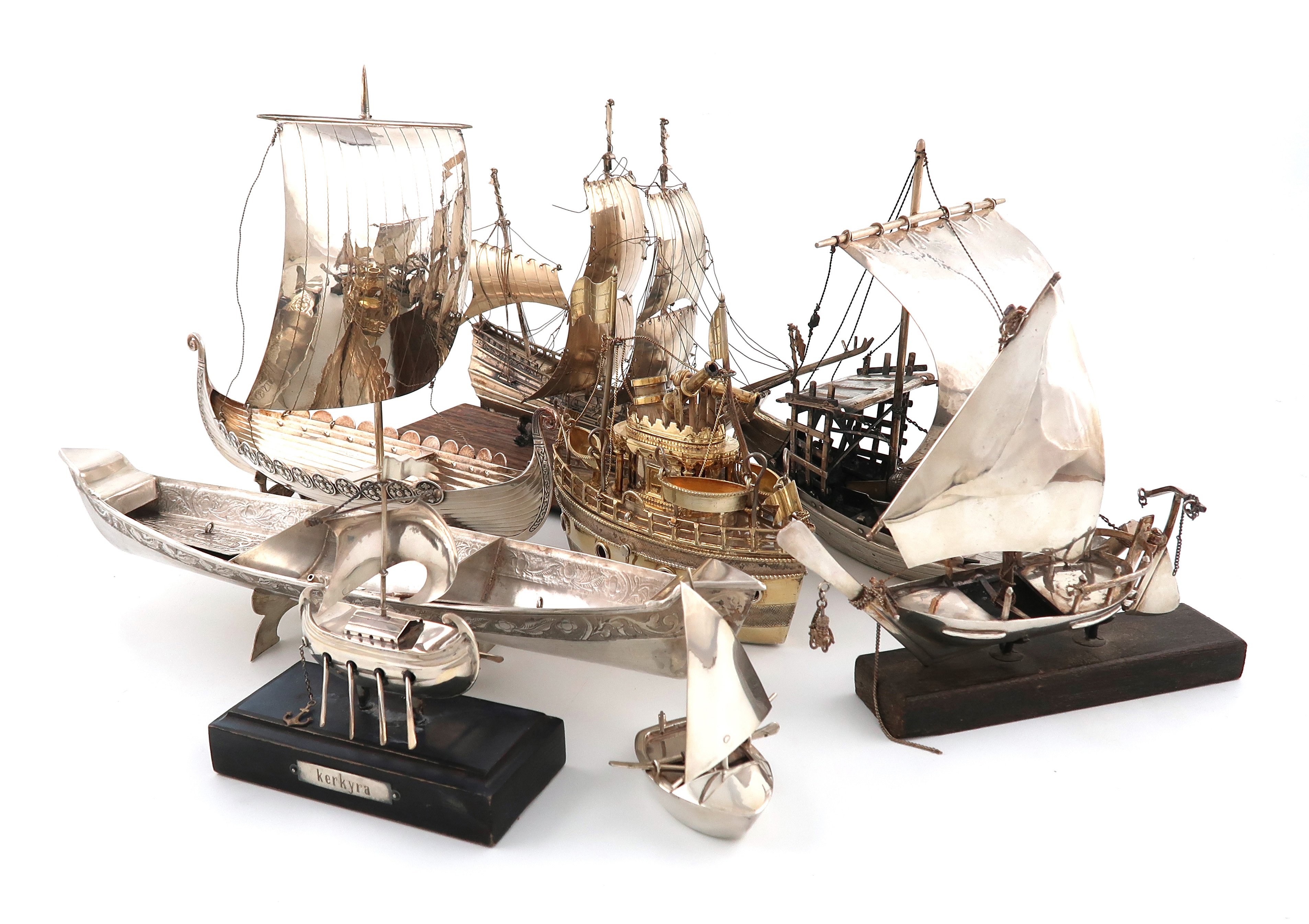 including: a Portuguese Rabelo boat, in full sail, mounted with three port barrels, a Dutch silver galleon in full sail, on a wooden plinth, an unmarked Viking longboat on a stand, a gunboat, a Kerkyra boat, a Dhow boat, a canoe and a small sailing boat, approx. weight of Portuguese boat 20oz. (8)