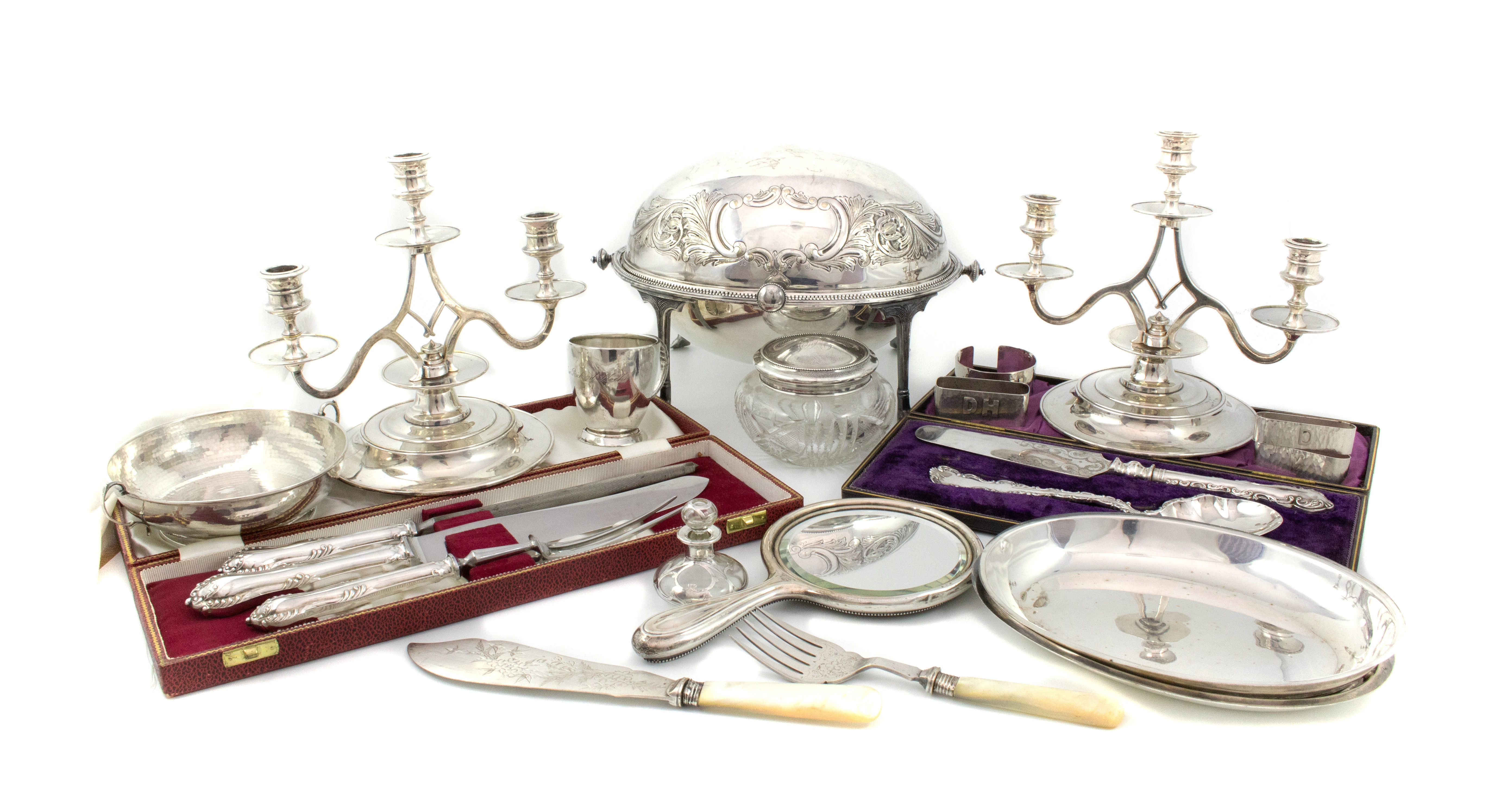 comprising: a silver christening cup, a two-handled bowl, four napkin rings, a silver-mounted hand mirror, a jar and a scent bottle, plus electroplated items: a pair of three-light candelabra, a breakfast roll top serving dish, a pair of fish servers, a cased carving set and a cased cake slice and spoon, total approx. weighable 14.1oz. (16)