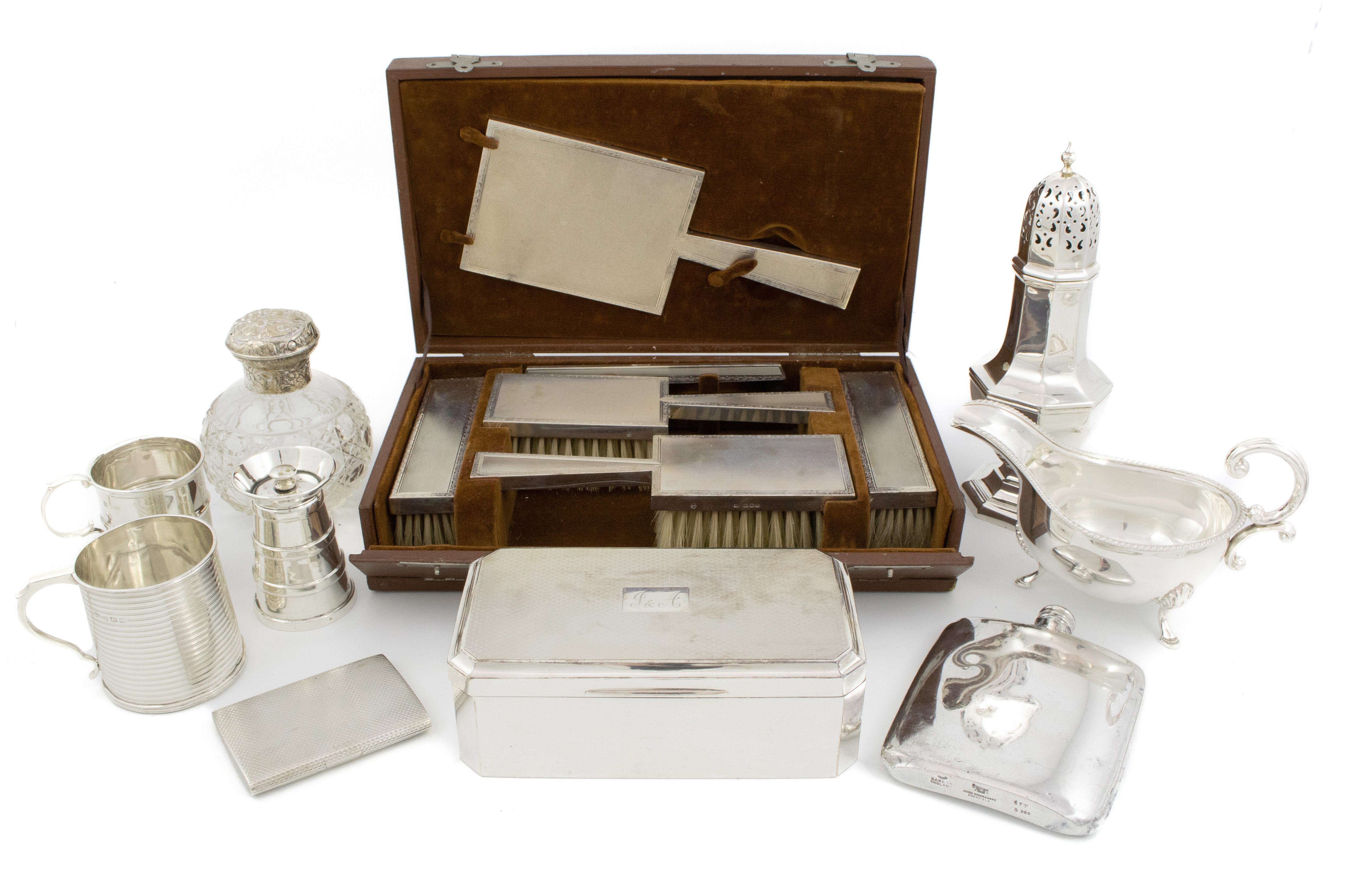 comprising of silver items: a sauce boat, two mugs, a pepper mill, a sugar caster, a cigarette box, a cigarette case and a cased six-piece dressing set, London 1944, with engine-turned decoration, plus an electroplated hip flask, total approx. weighable 22.8oz. (9)