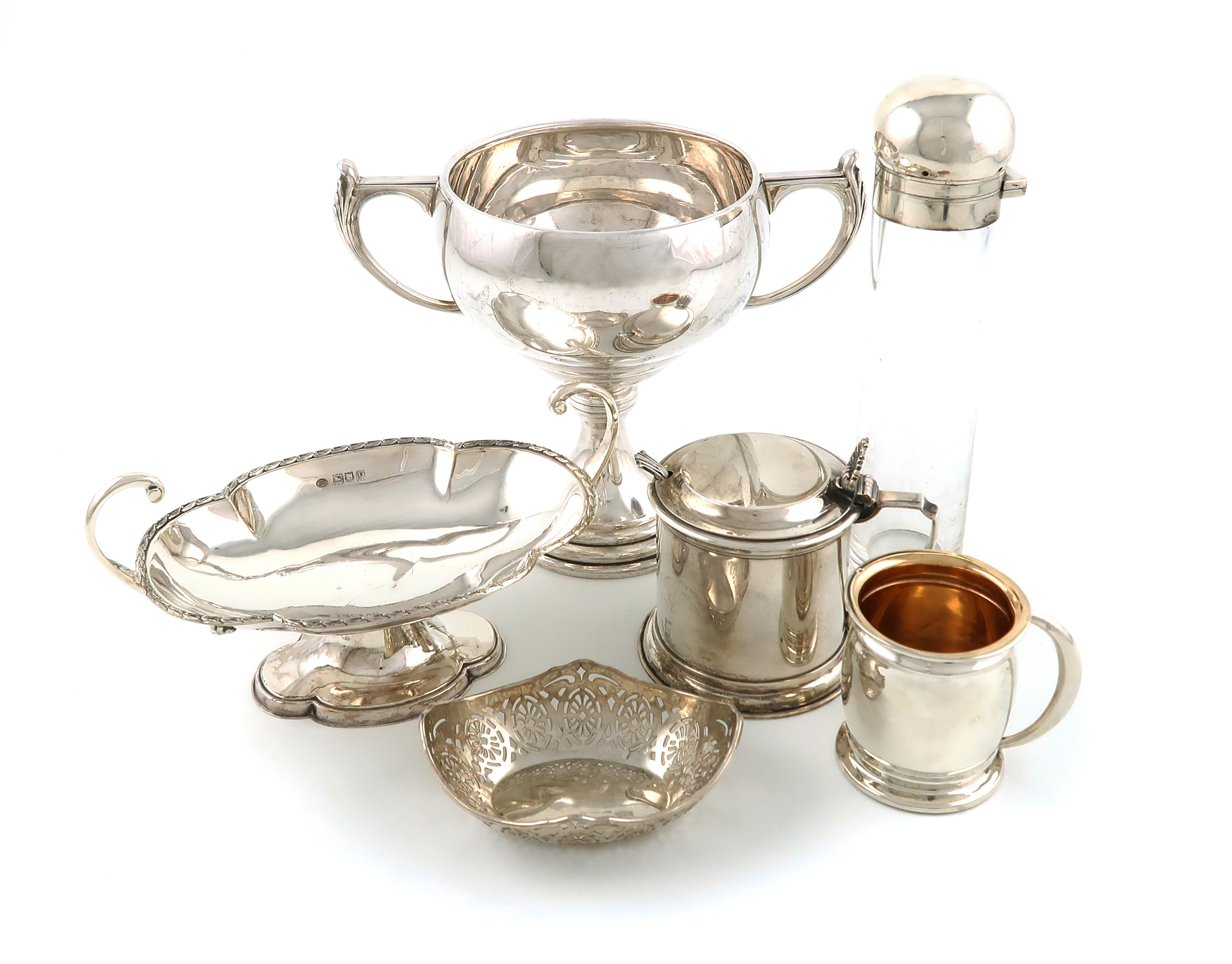 comprising: a large mustard pot, London 1912, a two-handled trophy cup, mug, a bonbon dish, a pierced dish and a silver-mounted glass toilet jar, approx. weighable 20oz. (6)