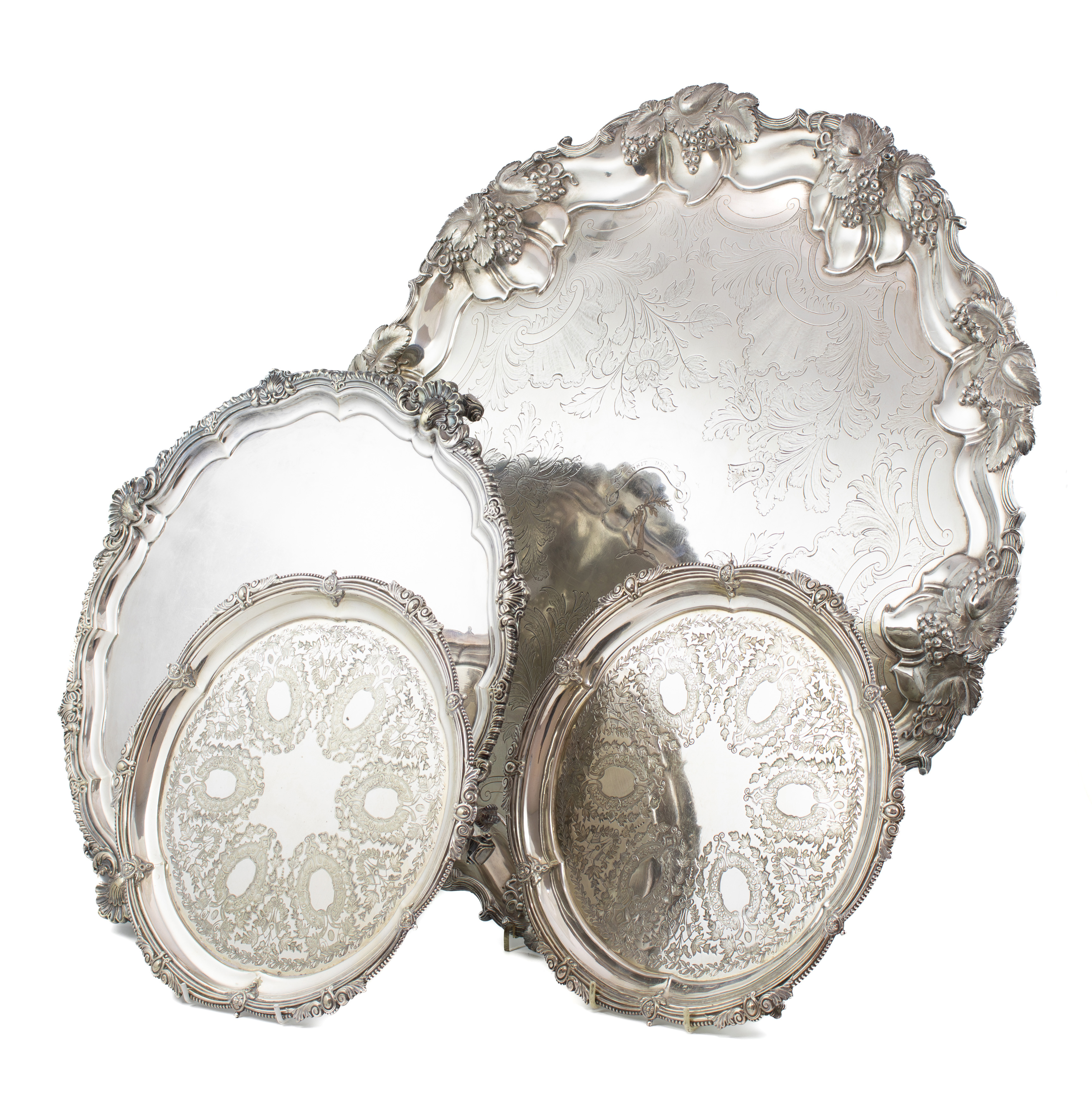 comprising: a large old Sheffield plate salver retailed by Sorley, Glasgow, a pair of Walker & Hall salvers and a Harrison Brothers & Howson salver, diameter 63.3cm. (4)