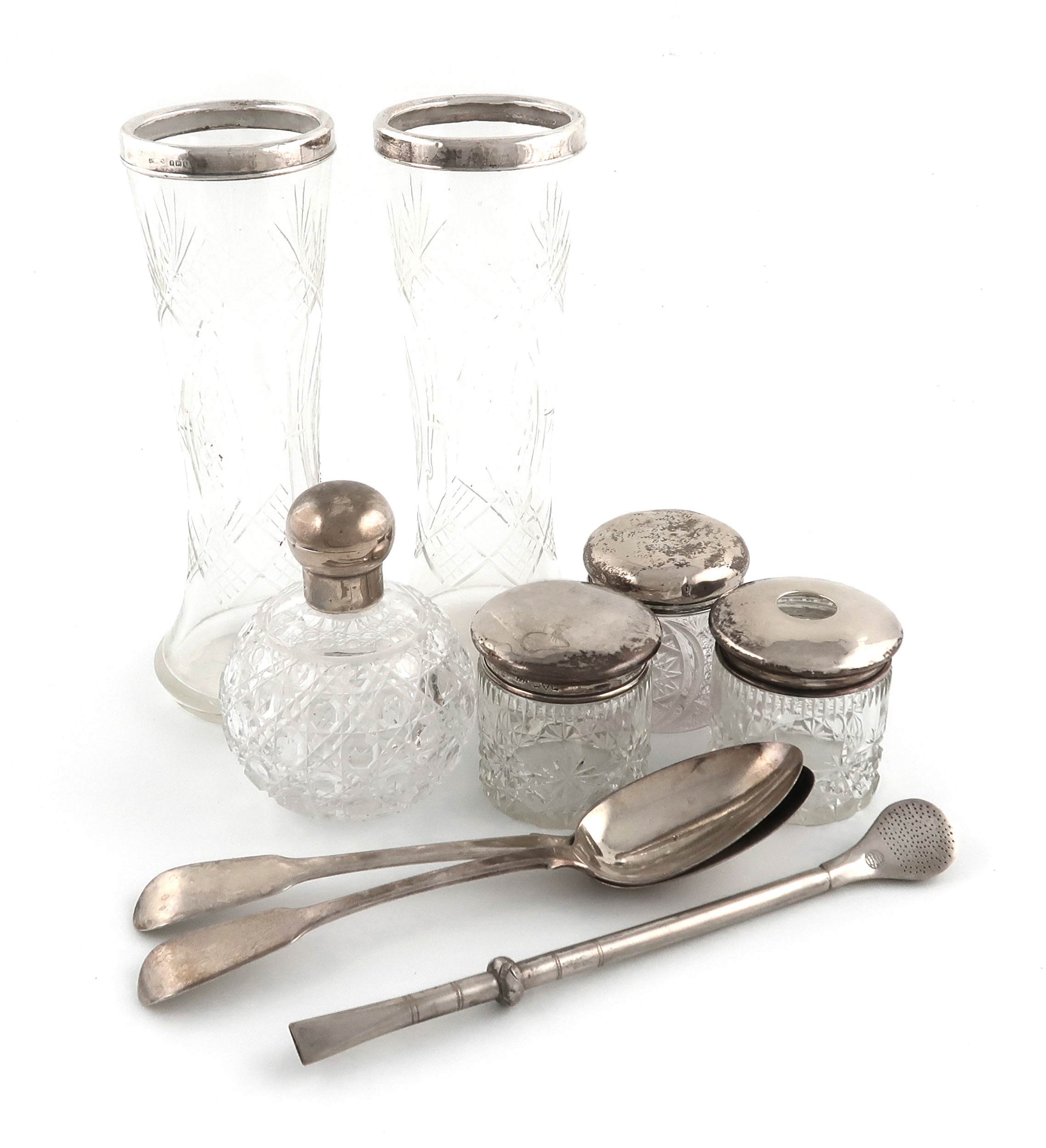comprising: a pair of silver-mounted glass vases, London 1922, a silver-mounted scent bottle, three silver-mounted jars, a pair of silver Fiddle pattern tablespoons, and a metalware mate straw, approx. weighable 6.6oz. (9)