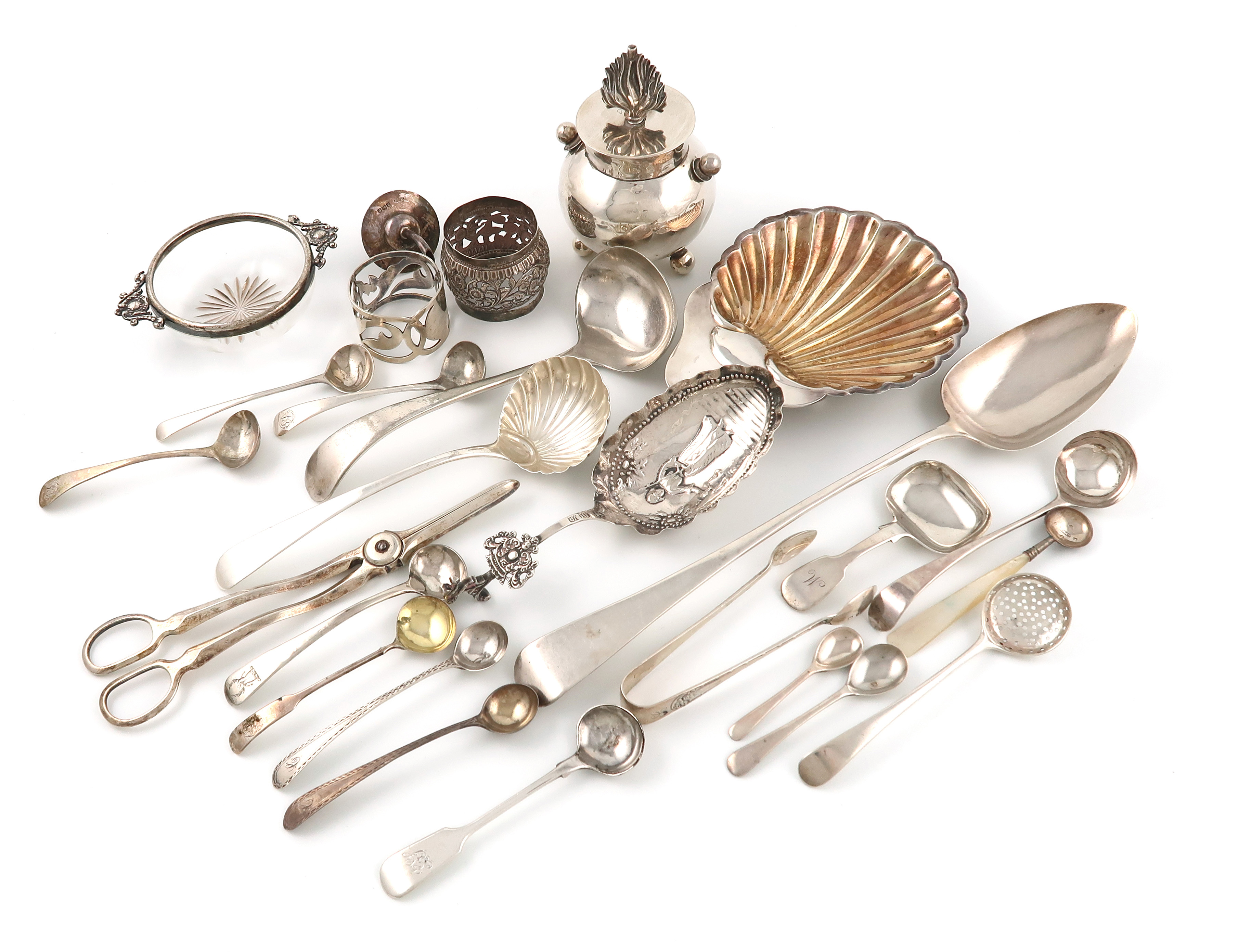 comprising: a Victorian table cigar lighter, globular form, flame finial, plus a Dutch spoon, and Exeter basting spoon, q shell butter dish, a silver-mounted glass dish, a sauce a ladle, a pair of grape scissors, two napkin rings, a bottle stopper, an Aberdeen caddy spoon, by George Booth, and a small quantity of salt spoons and an electroplated ladle, approx. weighable 19.7oz. (qty)