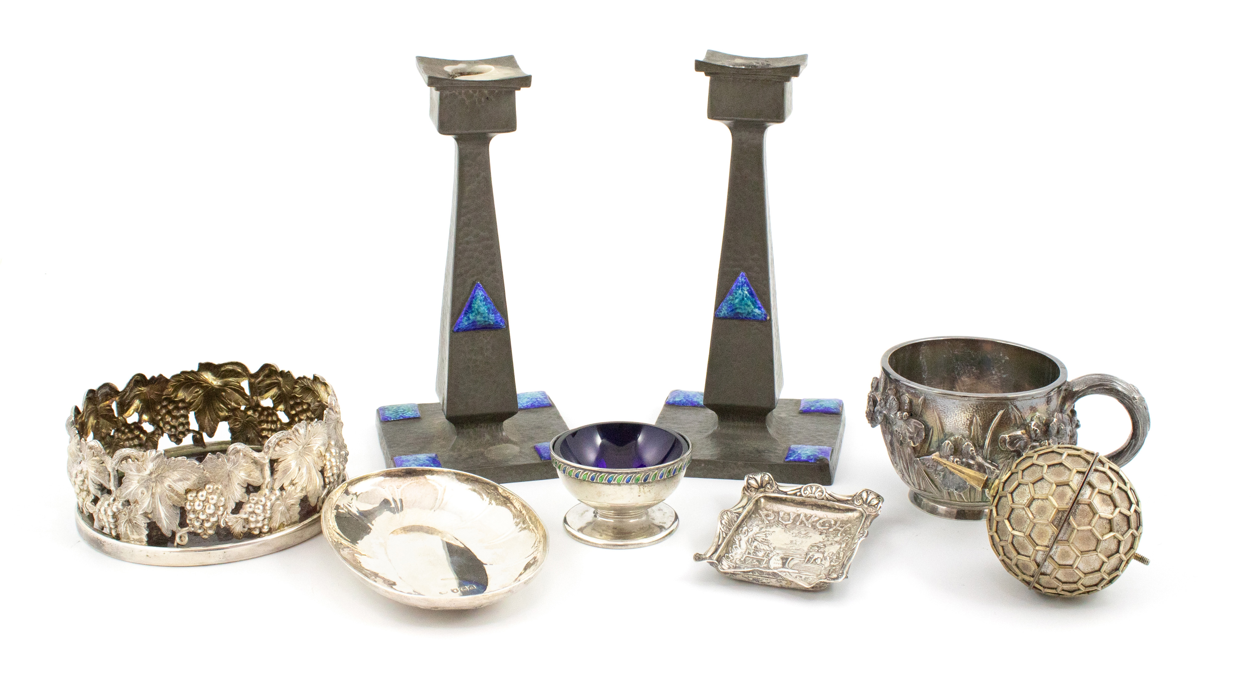 oblong form with spot-hammered decoration, length 15cm, plus a Liberty & Co. silver and enamel salt cellar, a Punch pin tray, a parcel-gilt hinged orb, a Japanese silver mug, an electroplated wine coaster, and a pair of pewter and enamel art nouveau candlesticks, total approx. weighable 17.9oz. (8)