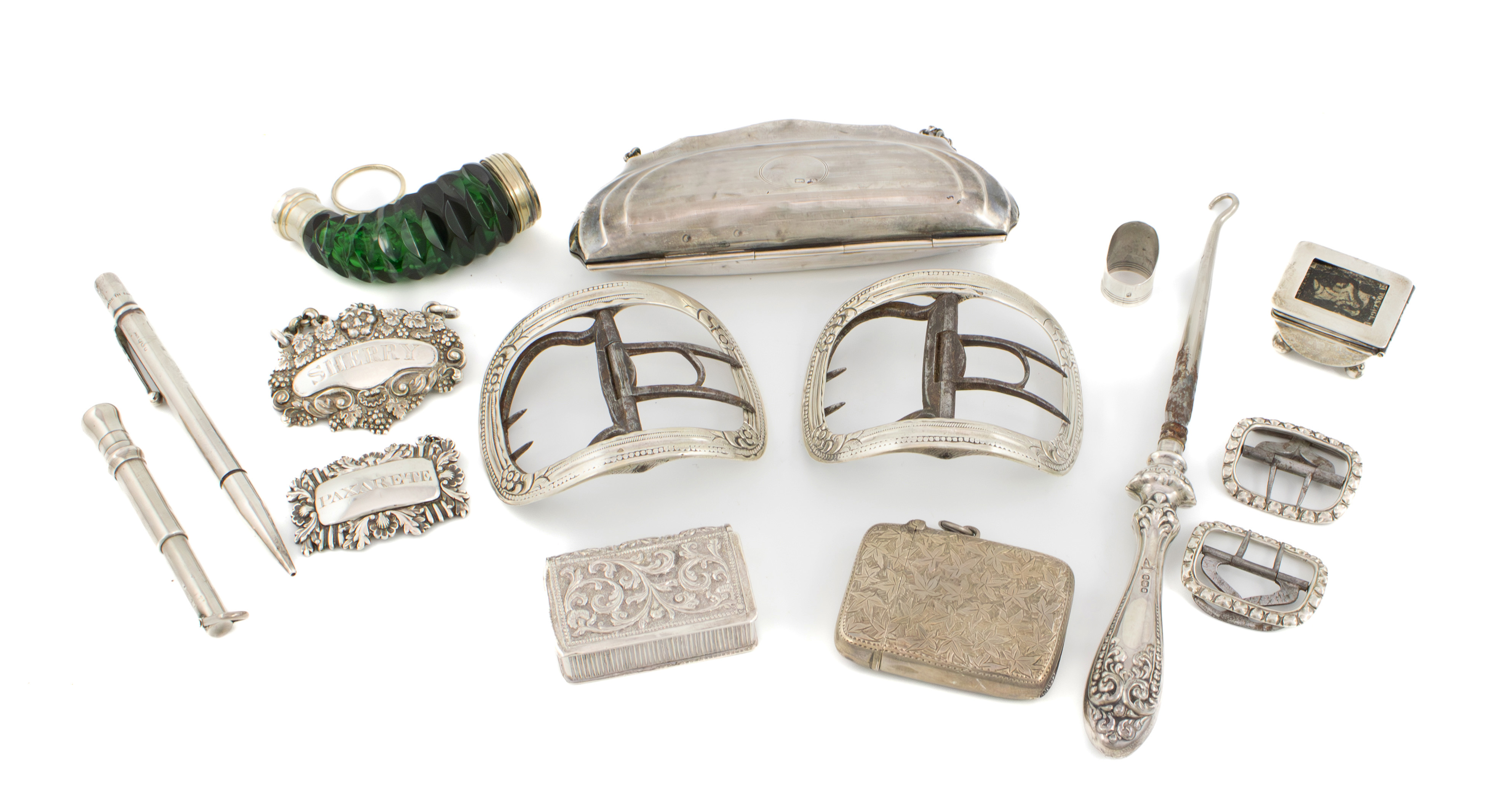 comprising: four buckles, two vesta cases, two wine labels, a button hook, a cigar piercer, a purse, a pencil, a stamp box the cover set with a Penny Black stamp, a fingernail guard and an unmarked silver-gilt mounted scent bottle/vinaigrette, total approx. weighable 6.4oz. (15)