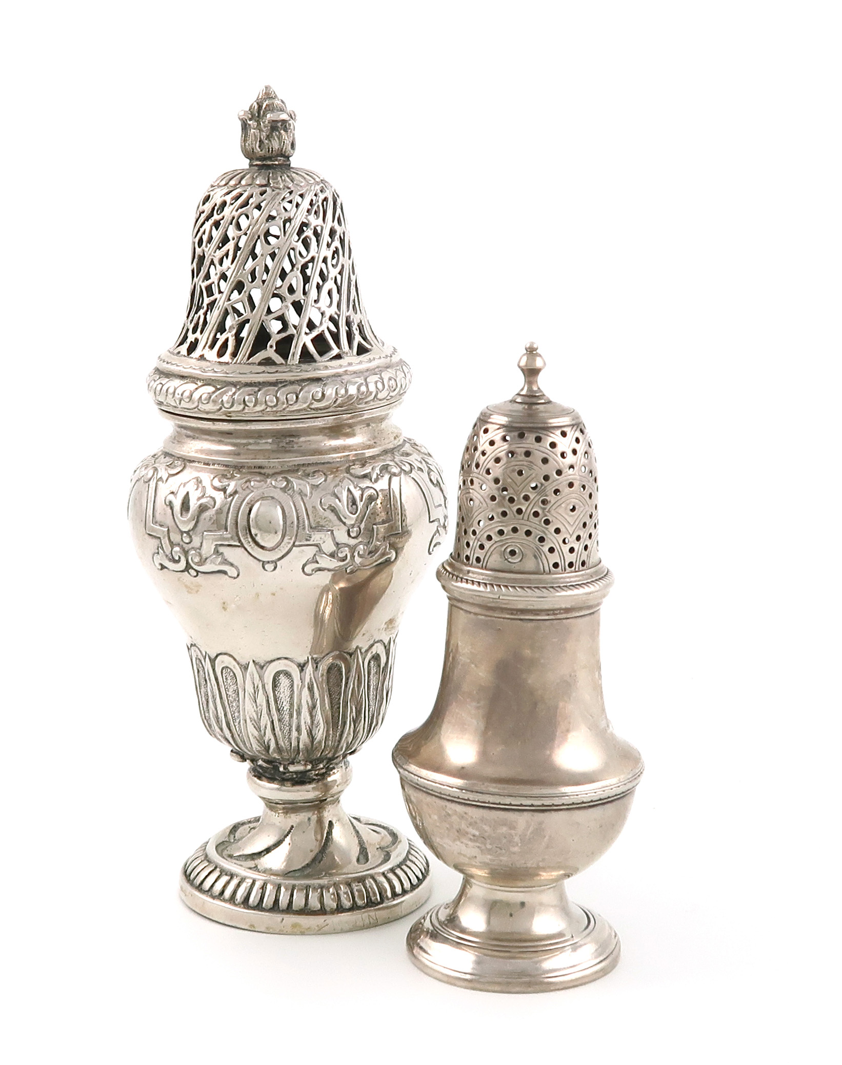 circular bellied form, plus a 19th century continental silver sugar caster, baluster form, foliate decoration, approx. total weight 7.7oz. (2)