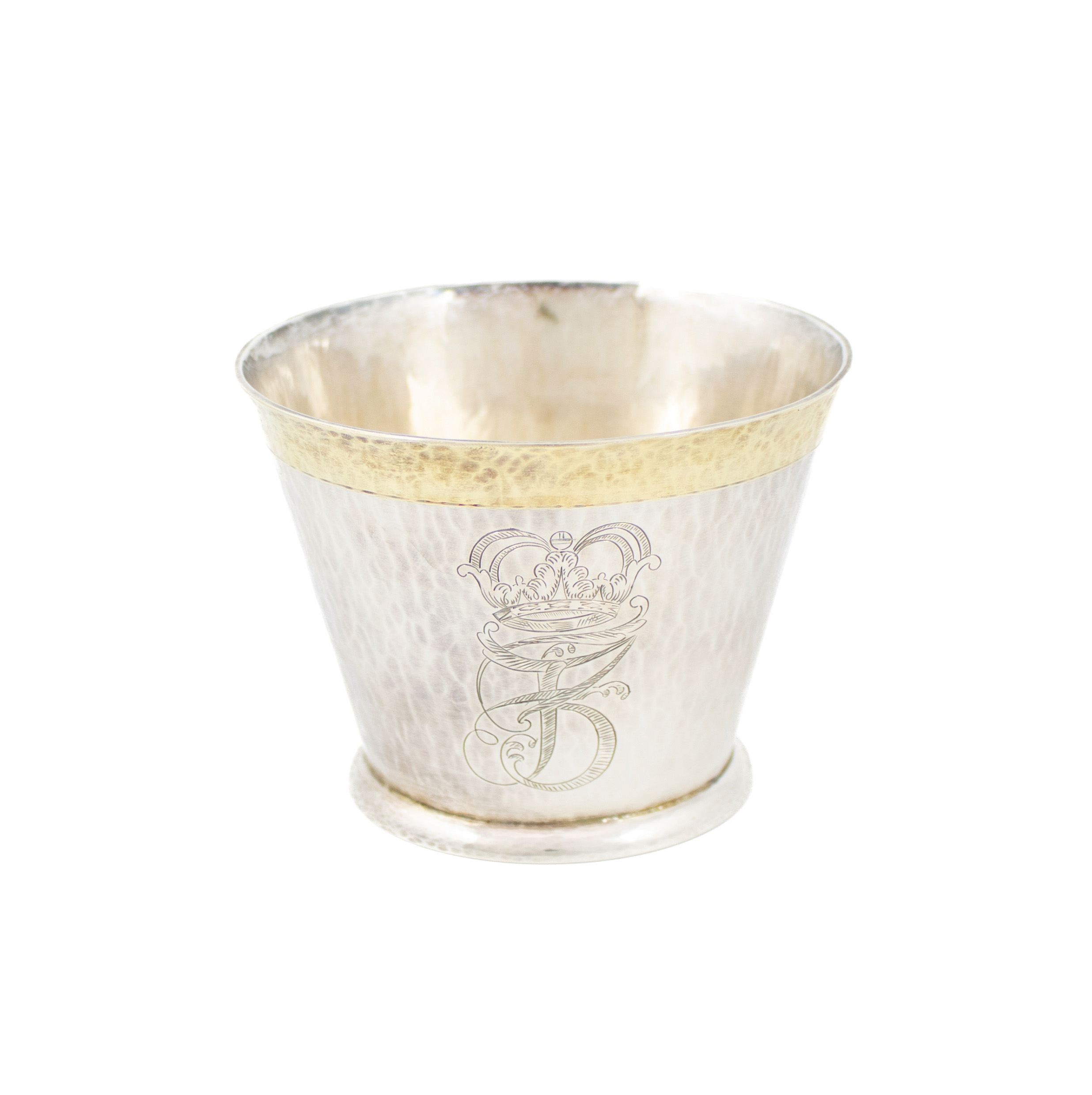circular tapering form, spot-hammered decoration, engraved crowned initials, a band of silver-gilt to the top rim, inscription to the base translates to 'Copy of original made in Copenhagen 1667', diameter 9.7cm, approx. weight 8.3oz.