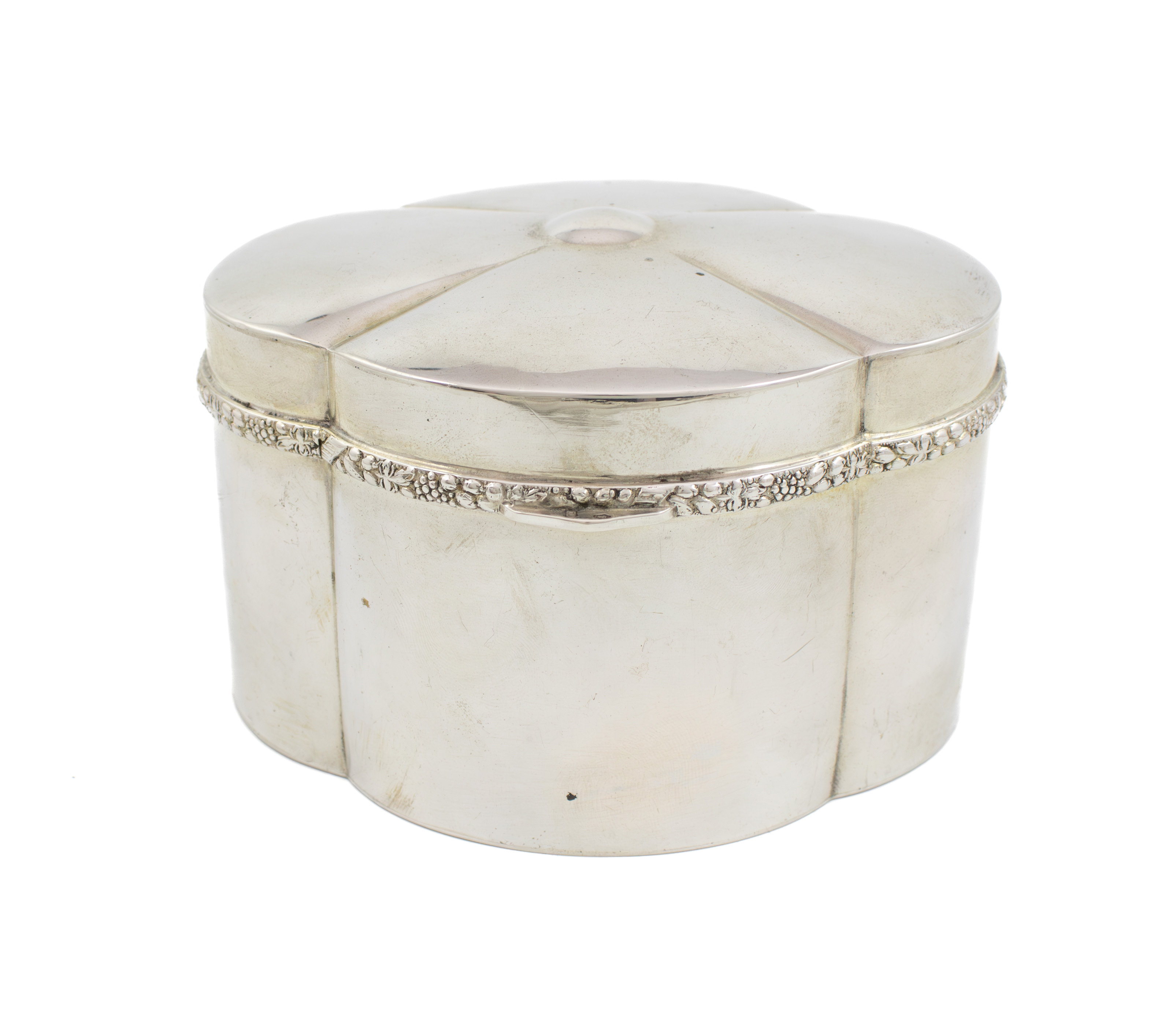 shaped oval form, a band of foliate decoration to the edge of the hinged cover, length 12.3cm, approx. weight 11.1oz.