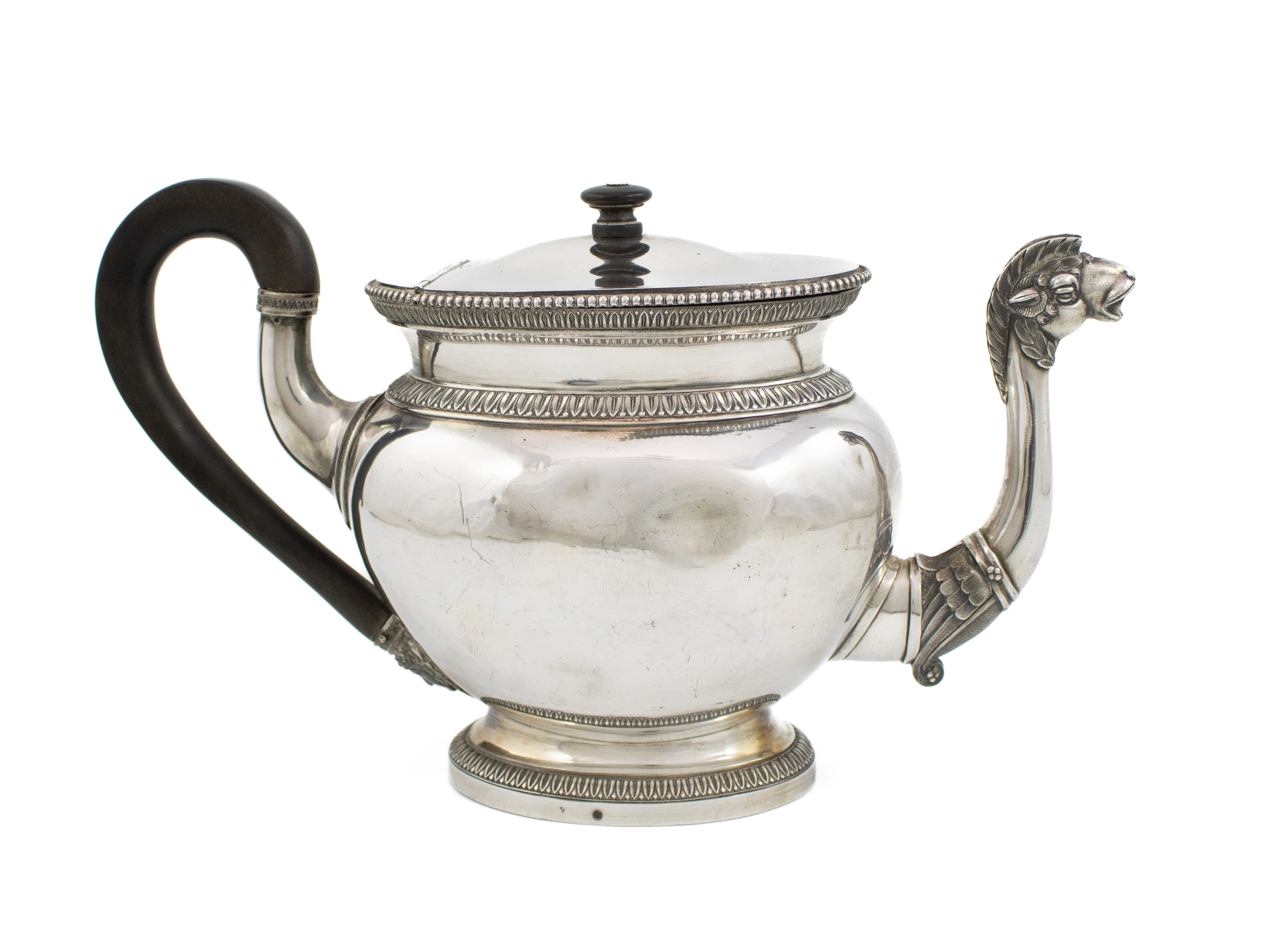 oval form, beaded and gadrooned borders, the spout is modelled after the neck and head of a camel, a slight domed flush hinged cover with wooden knop finial, wooden scroll handle, on raised oval foot, length handle to spout 28.8cm, approx. weight 26.6oz.