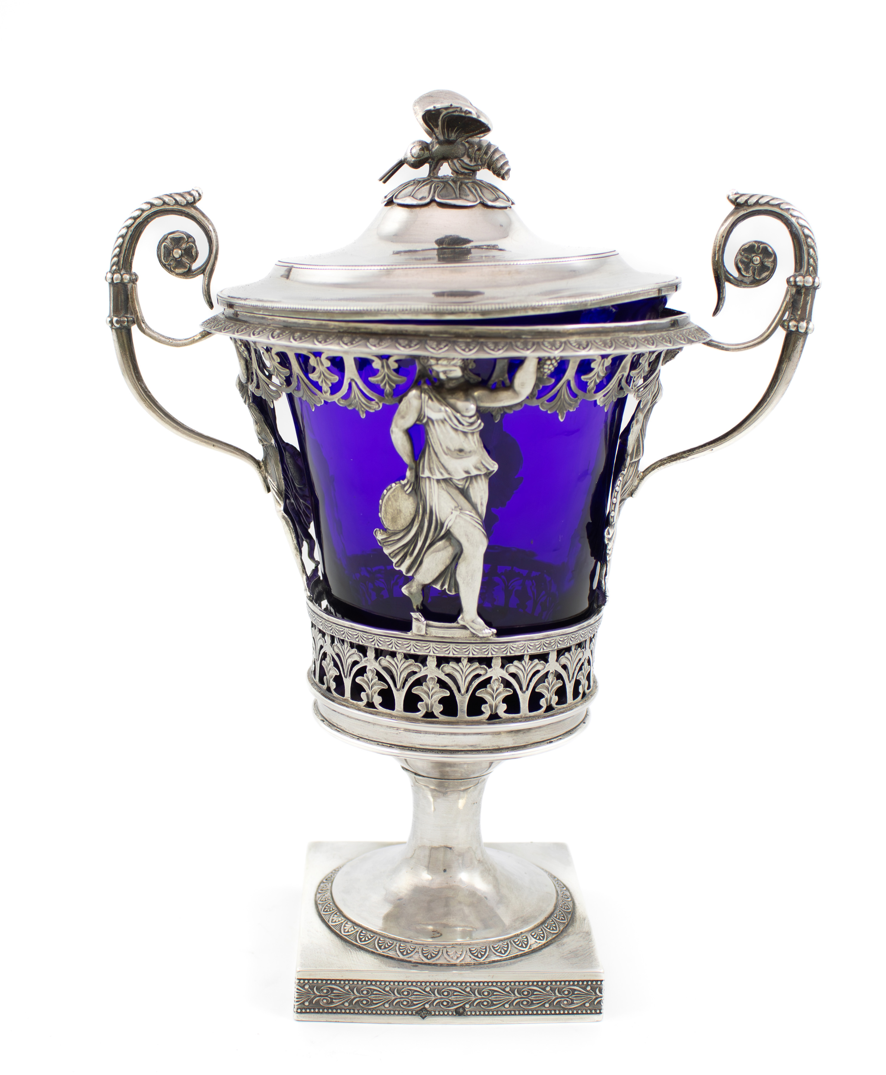 vase form, pierced decoration of foliate swags and classical nymphs, foliate borders, two scroll handles, a blue glass liner, possibly associated domed cover with a insect finial, a raised circular foot on a square base, height 21.8cm, approx. weight 12.5oz.