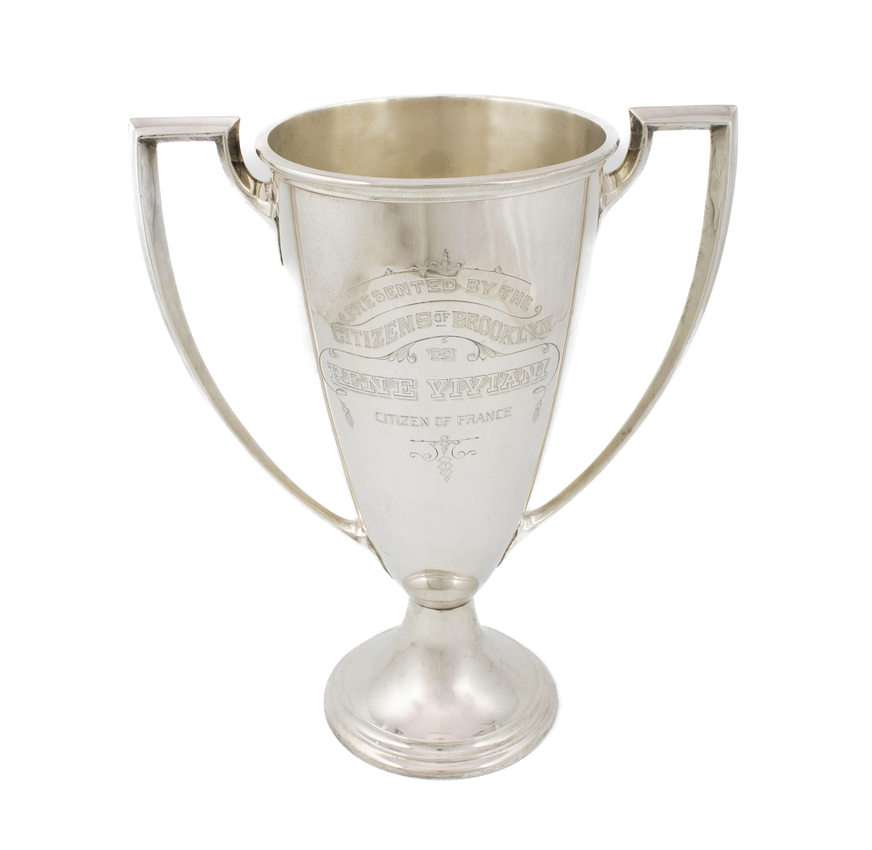 slender vase form, scroll handles, on a raised circular foot, inscribed 'Presented by the Citizens of Brooklyn to Rene Vivani Citizen of France', the reverse inscribed 'Commemorating a Visit to Brooklyn to Dedicate The Harteau Memorial to the Marquis De Lafayette, May 10, 1917', height 36cm, approx. weight 42oz.