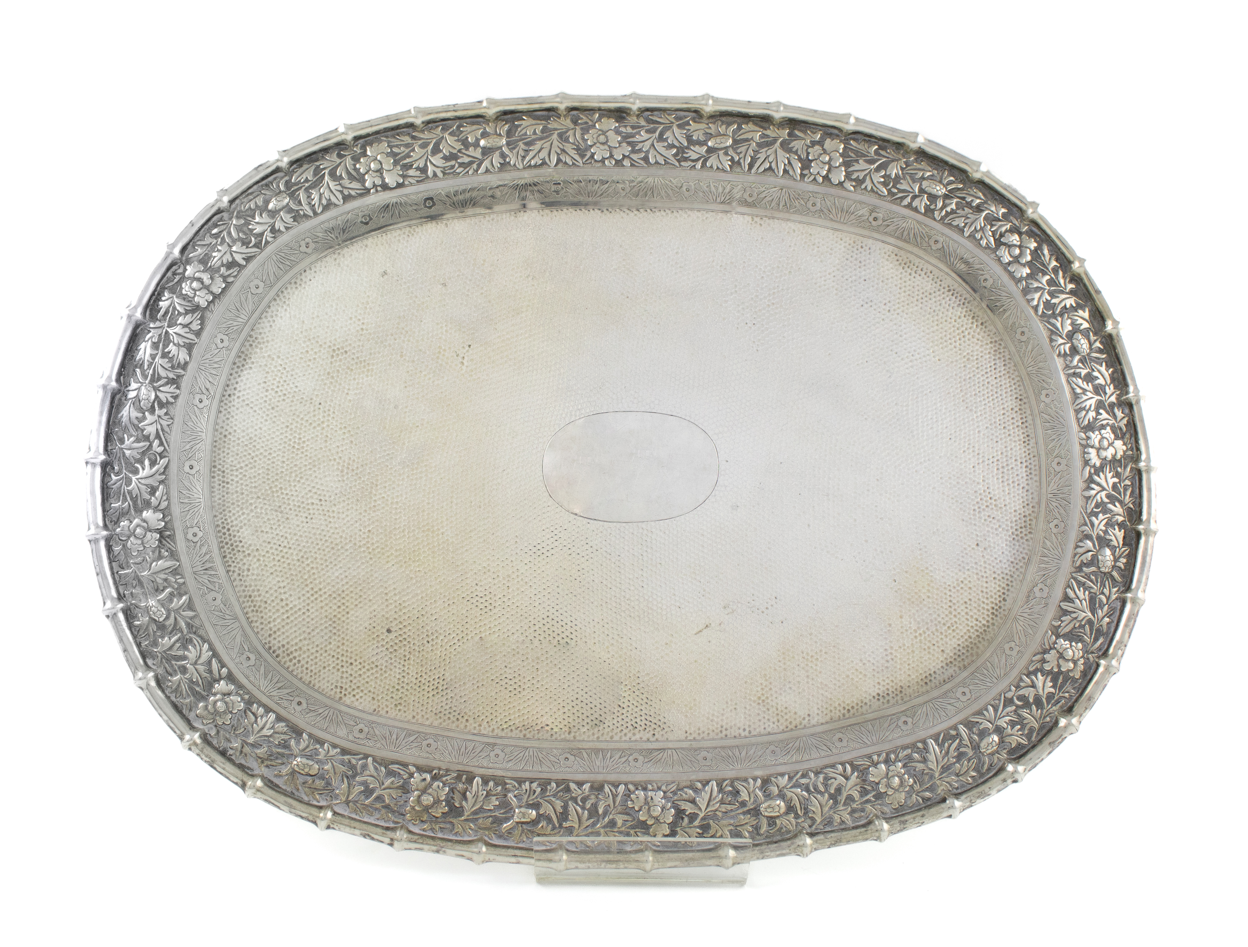 oblong form, embossed and engraved foliate decorated edge with spot hammered centre, border modelled after bamboo, length 35.1cm, approx. weight 19.4oz.