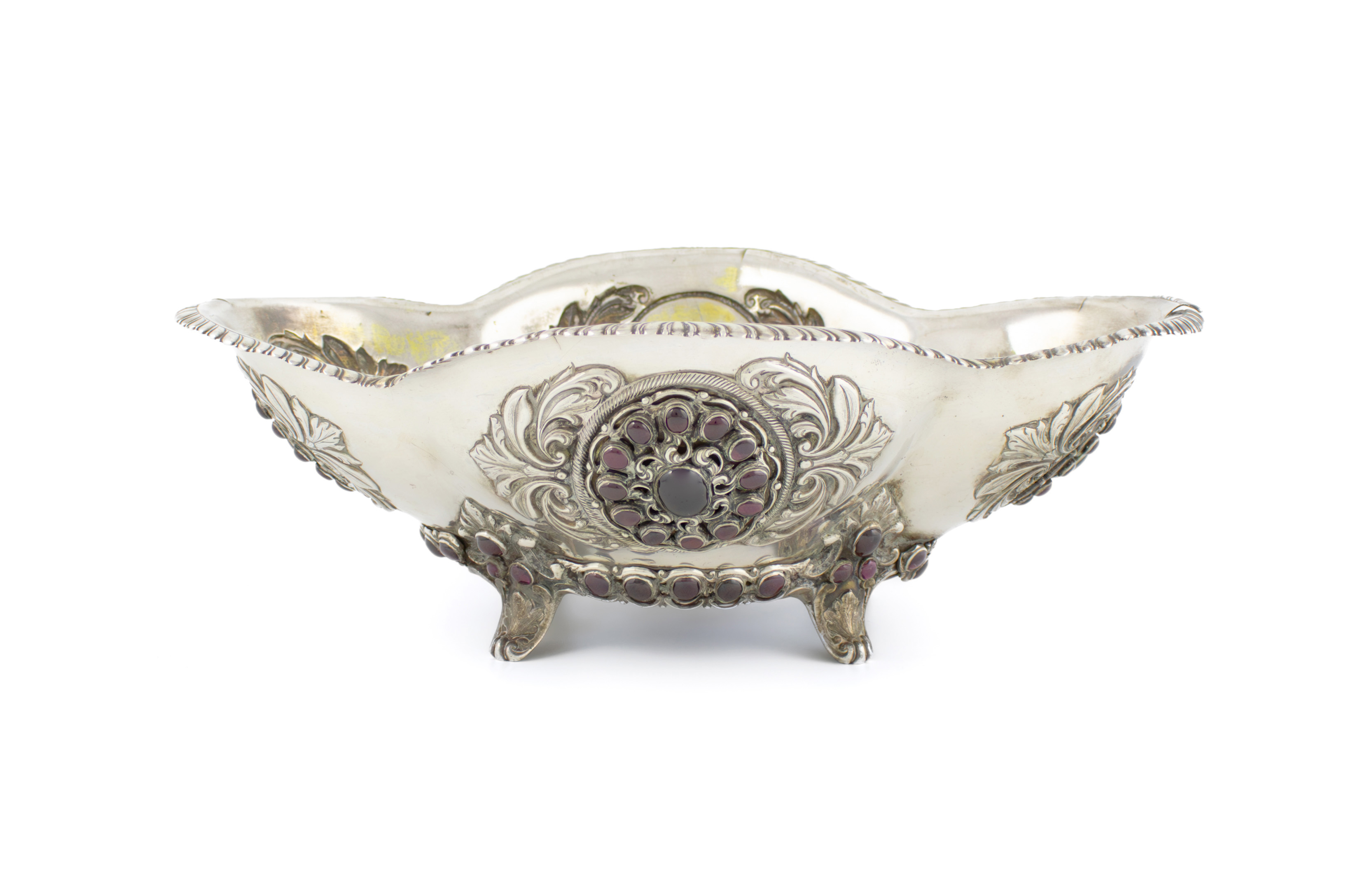 shaped oval form, embossed foliate decoration, and applied with oval cartouches of garnet cabochons, on four foliate bracket feet, length 32.8cm.