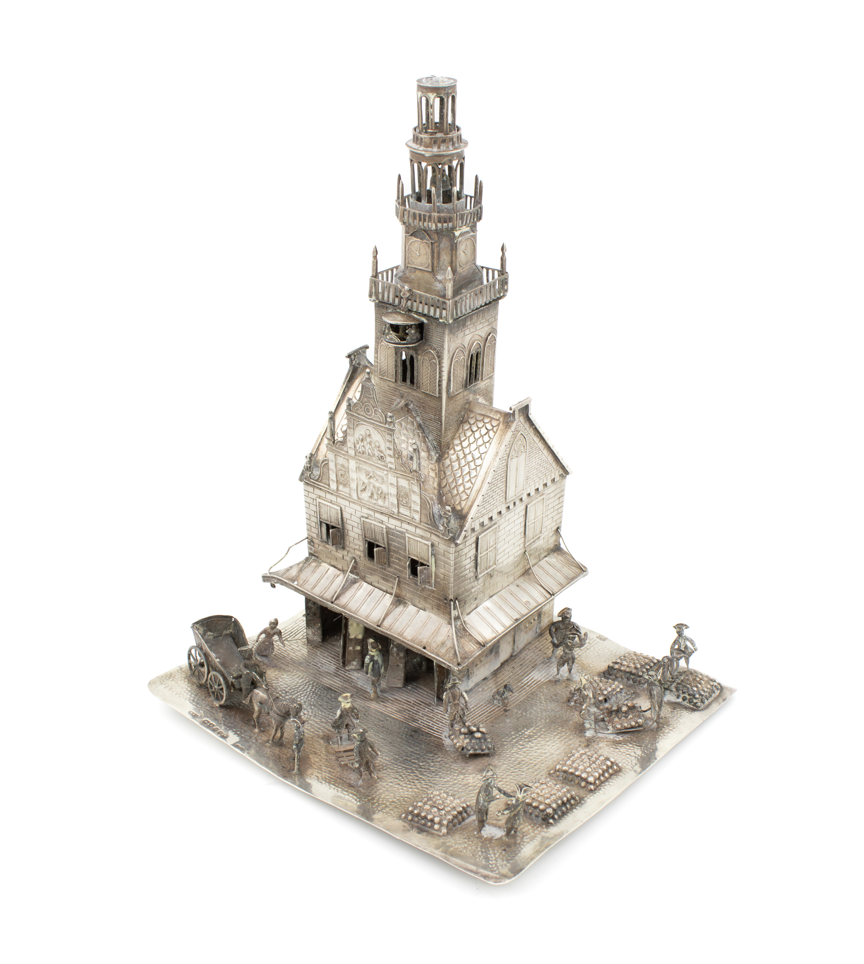 modelled as the Waag (cheese weighing house) in the market square mounted with figures, a horse and cart and stacks of cheese, length of base 15.3cm, height 20.5cm, approx. weight 13oz.