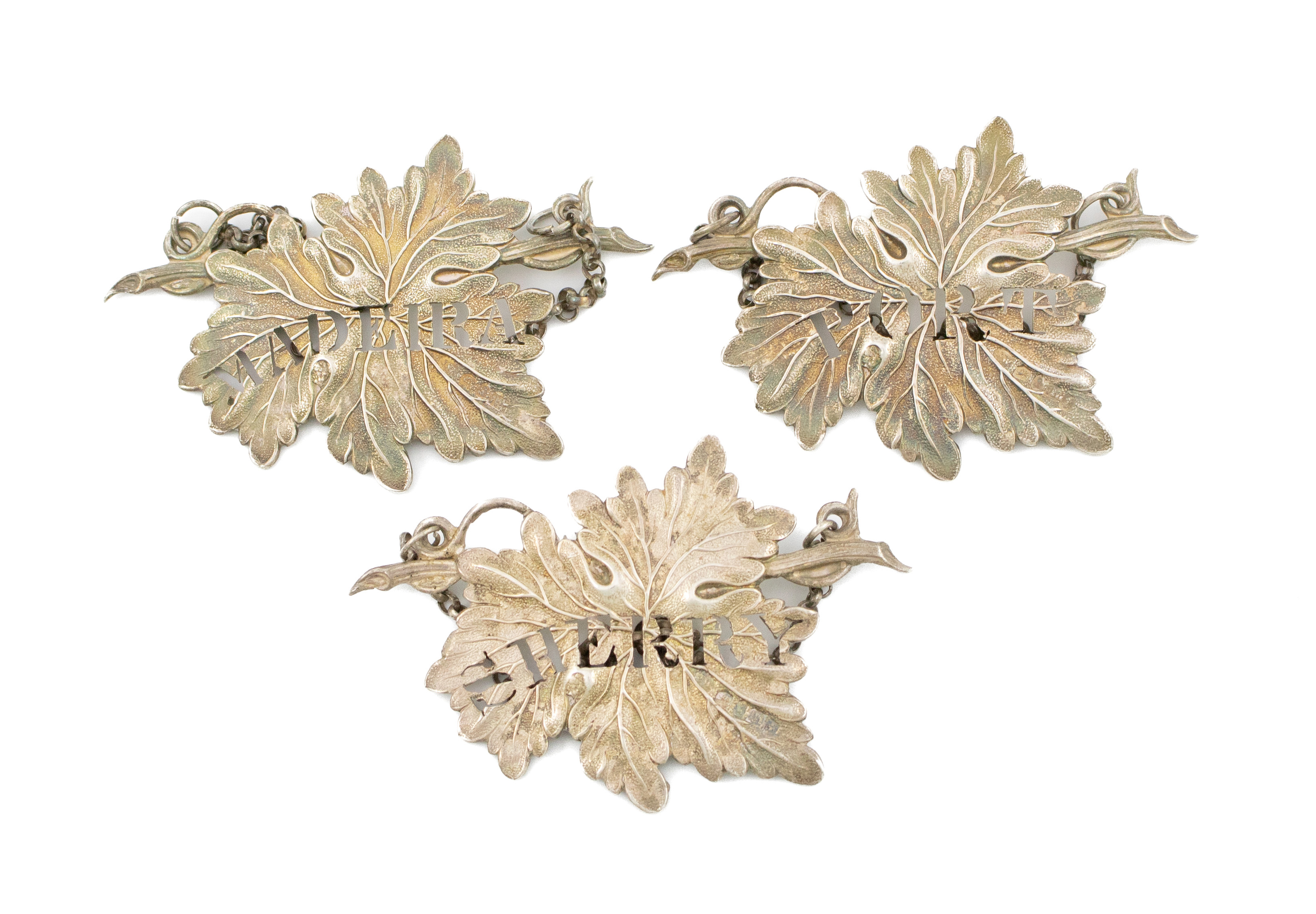 vine leaf form, pierced 'Port', 'Madeira' and 'Sherry', length 7cm, total approx weight 1.2oz. (3)