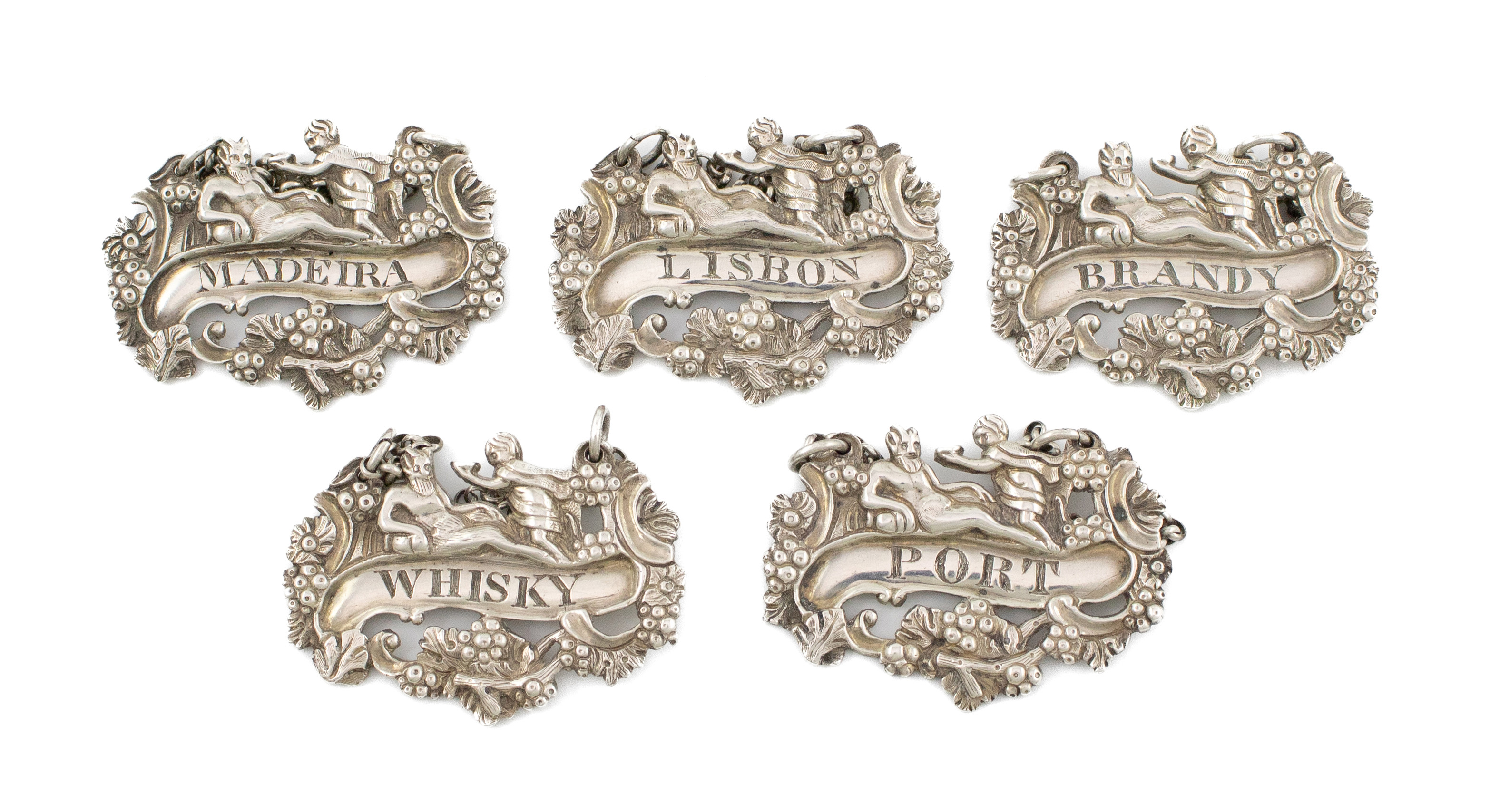 shaped oblong form, with foliate decoration and a cherub serving Bacchus, incised 'Madeira', 'Brandy', 'Port', 'Whisky' and 'Lisbon', length 5.4cm. (5)