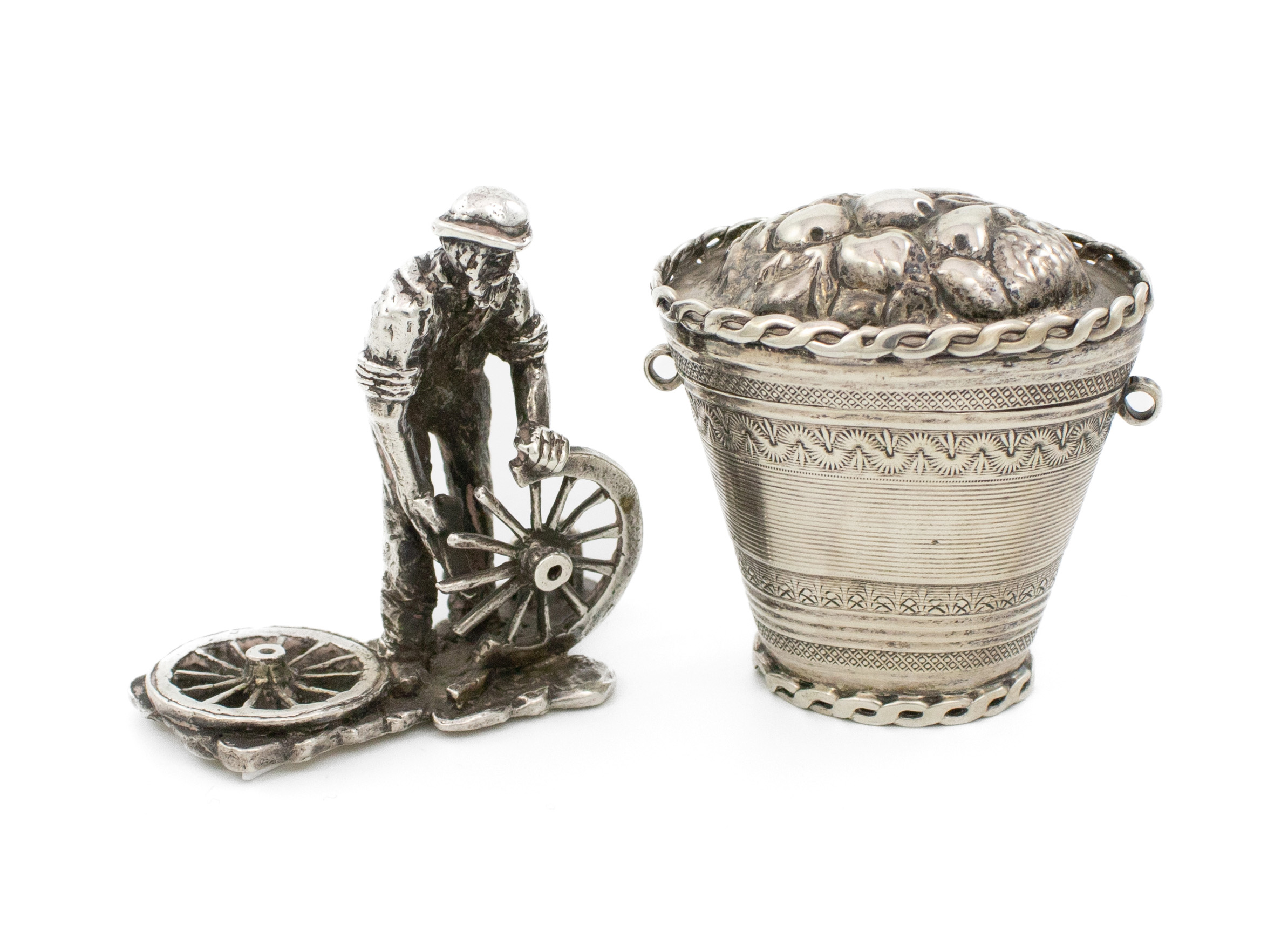 modelled as a basket of fruit, to the centre of the hinged cover is embossed fruit decoration, with two ring attachments, plus a silver cast model of a wheelwright fixing a cartwheel, marked TCJ, London 1981, height 4.7cm, total approx. weight 2.1oz. (2)