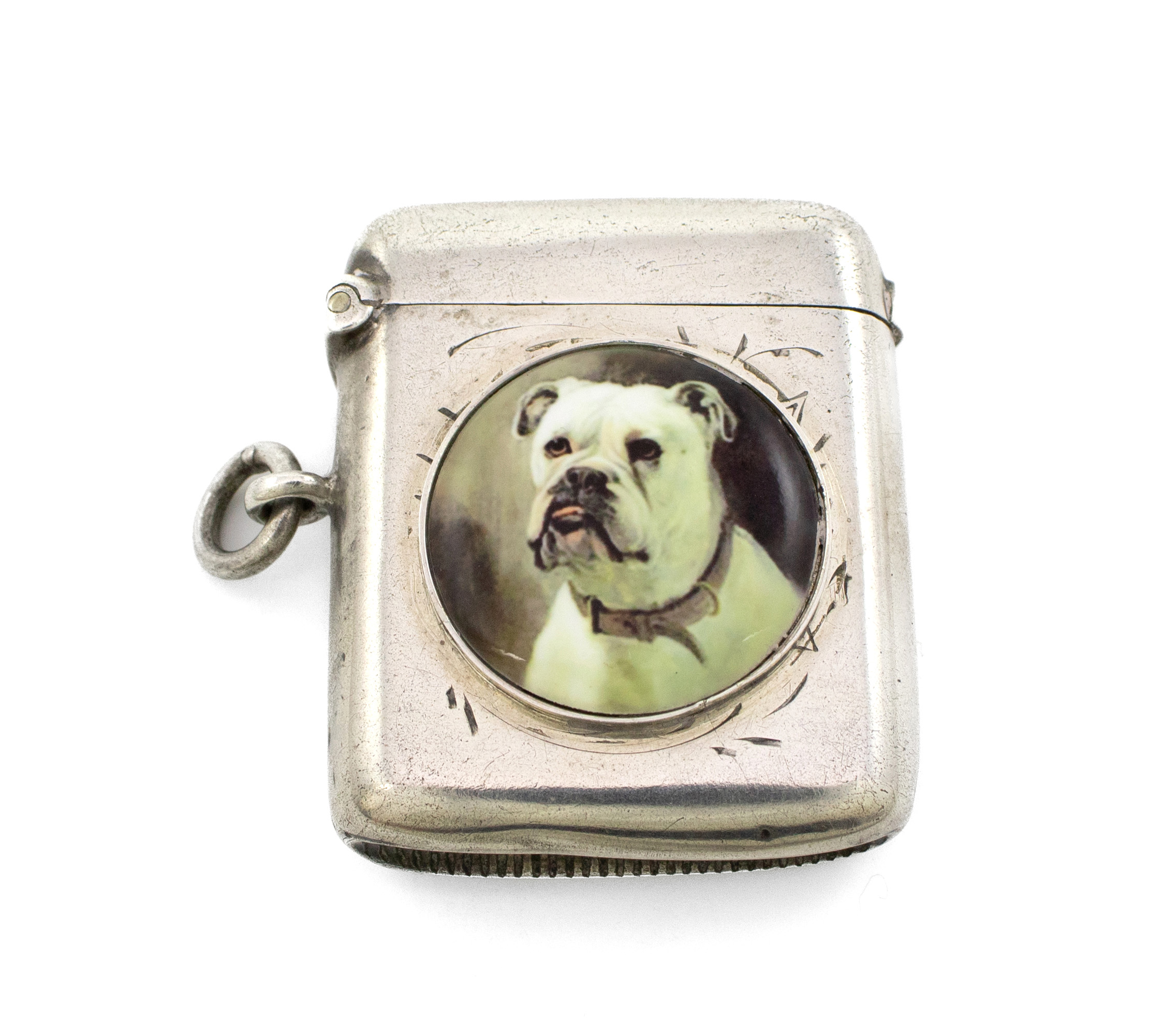 rectangular form, ring attachment, hinged cover, the front later enamelled of a boxer dog, height 4.4cm, approx. weight 1oz.