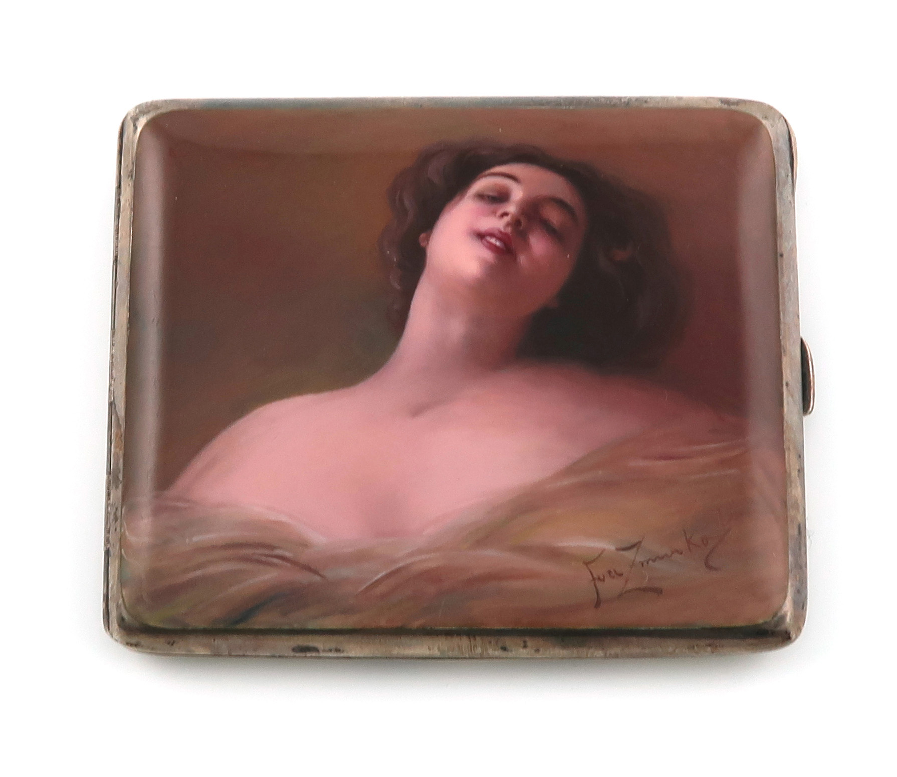 rectangular form, the hinged cover enamelled with the upper body of a lady, after the Polish artist F. Zmurko, the reverse inscribed 'Fred', length 9.5cm, approx. weight 5oz.