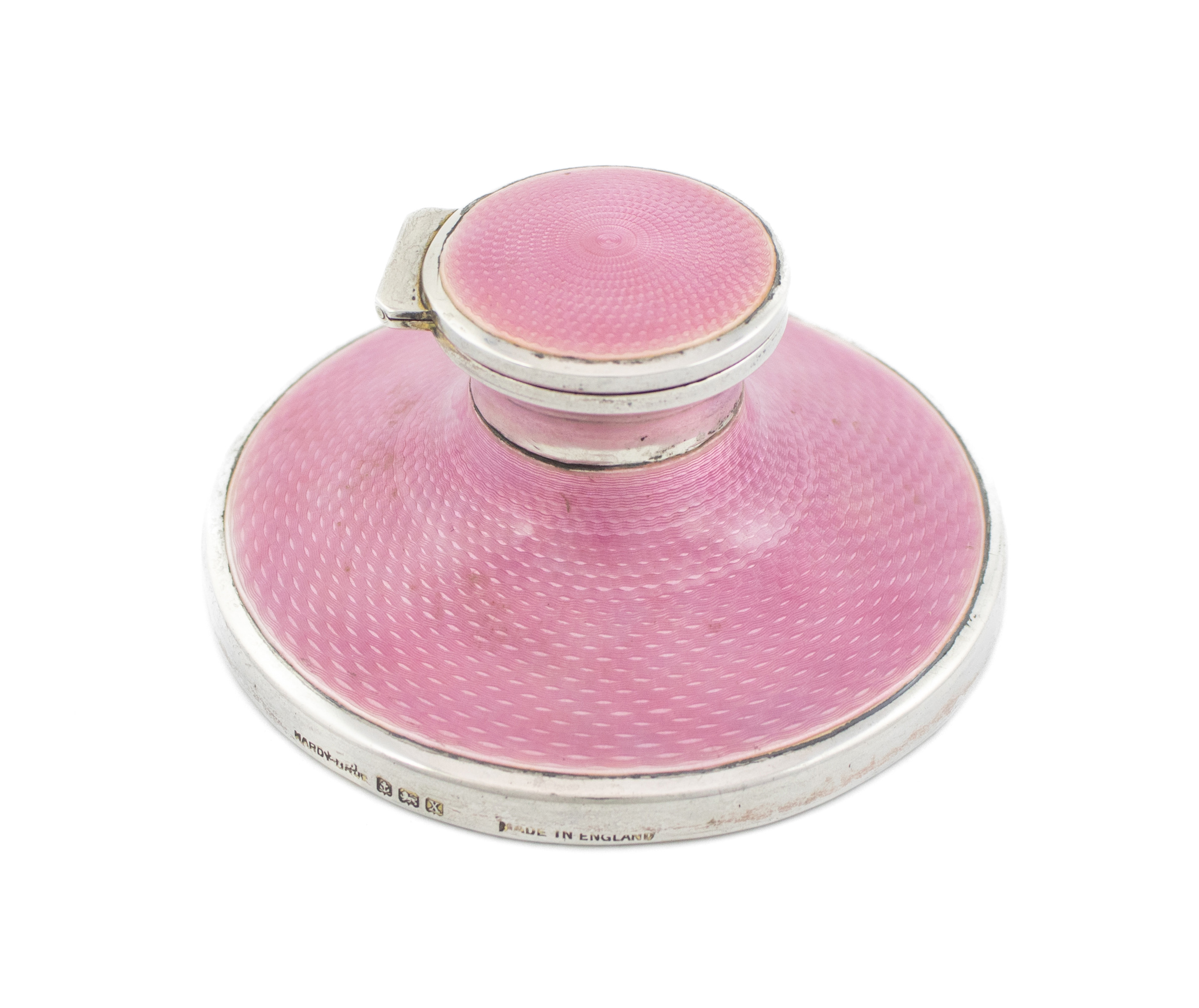 raised circular form, with pink enamel decoration to the body and hinged cover, with a glass ink liner, loaded base, diameter 10cm.