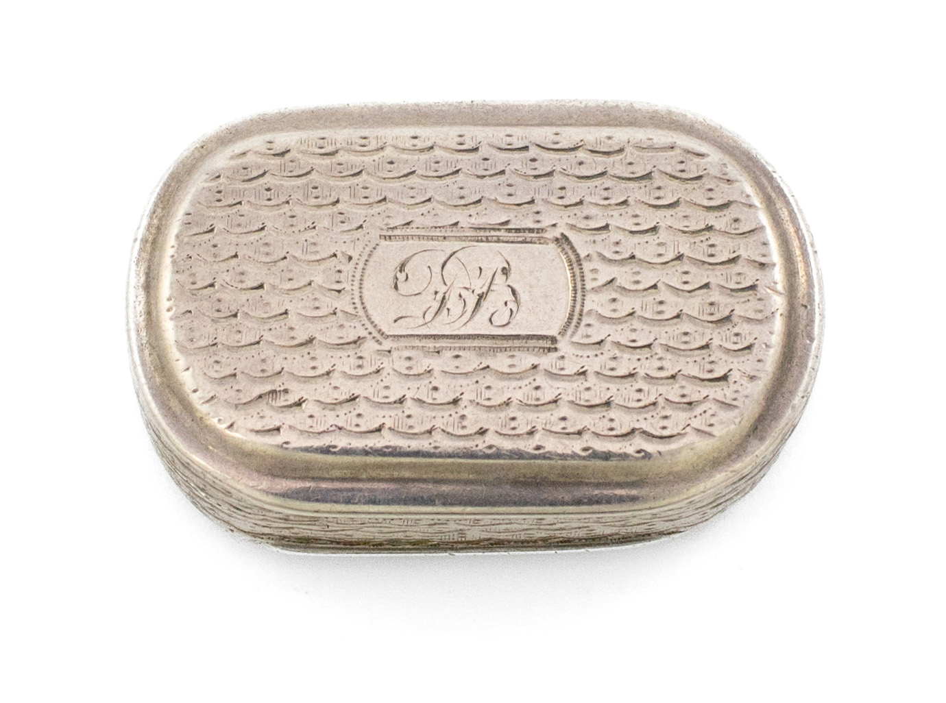 oblong form, engine-turned decoration, initialled hinged cover with a scroll decorated pierced gilded interior grille, length 3.2cm, approx. weight 0.4oz.
