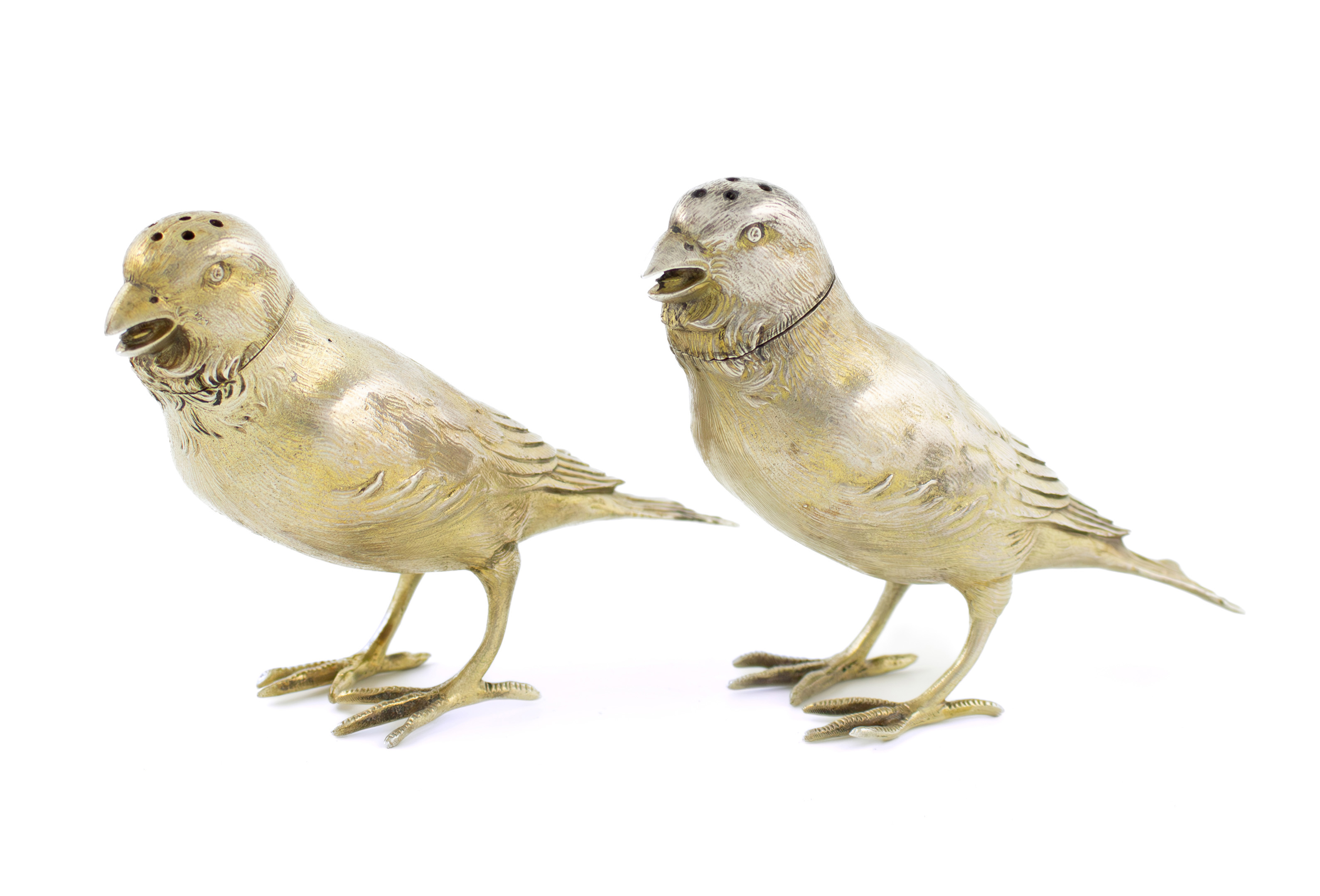 modelled as standing English songbirds, with textured feather decoration, length 9.2cm, total approx. weight 6.1oz. (2)