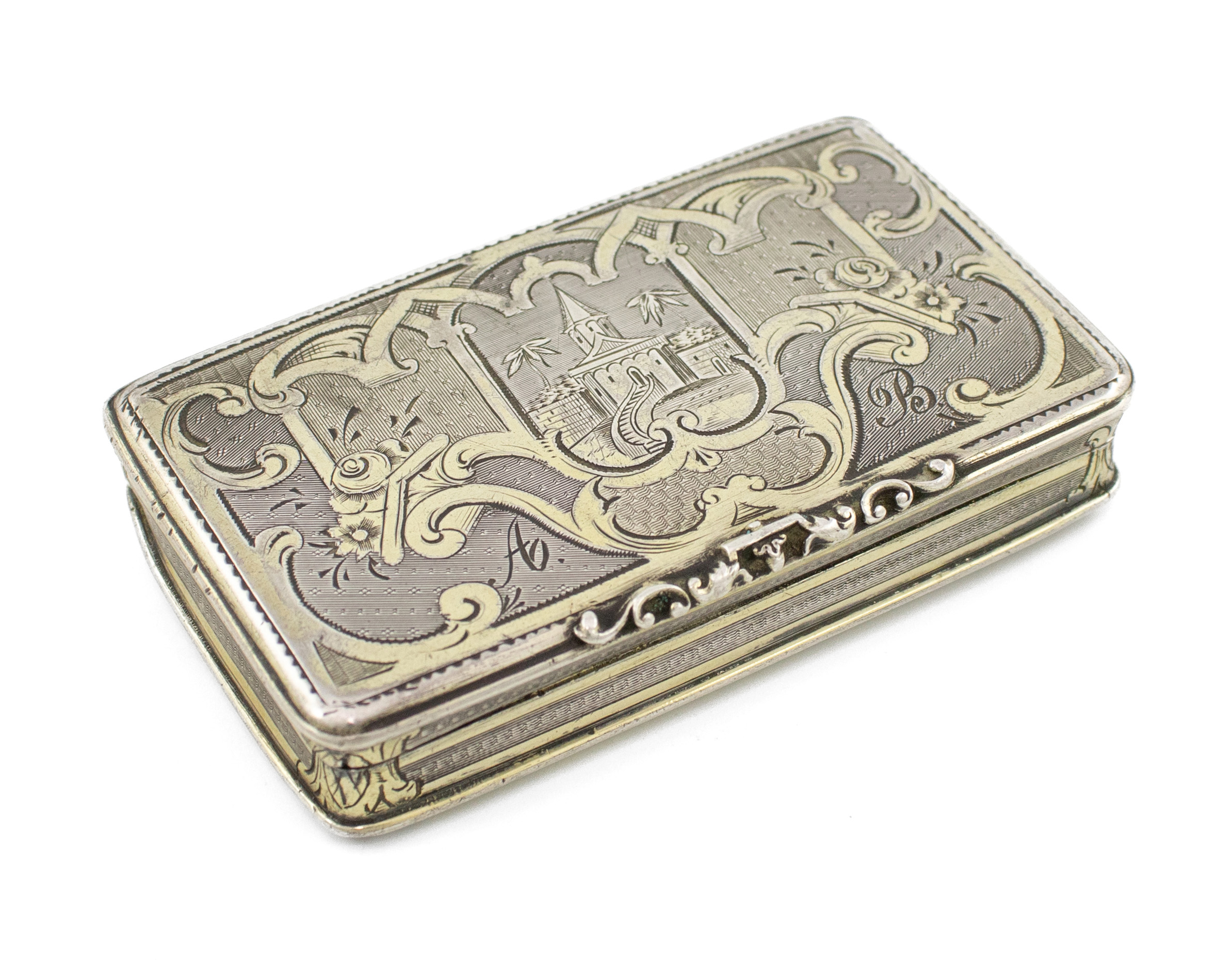 rectangular form, engine-turned decoration, the hinged cover engraved with a middle-eastern townscape surrounded with scroll decoration, with a gilt interior, length 7.6cm approx. weight 1.9oz.