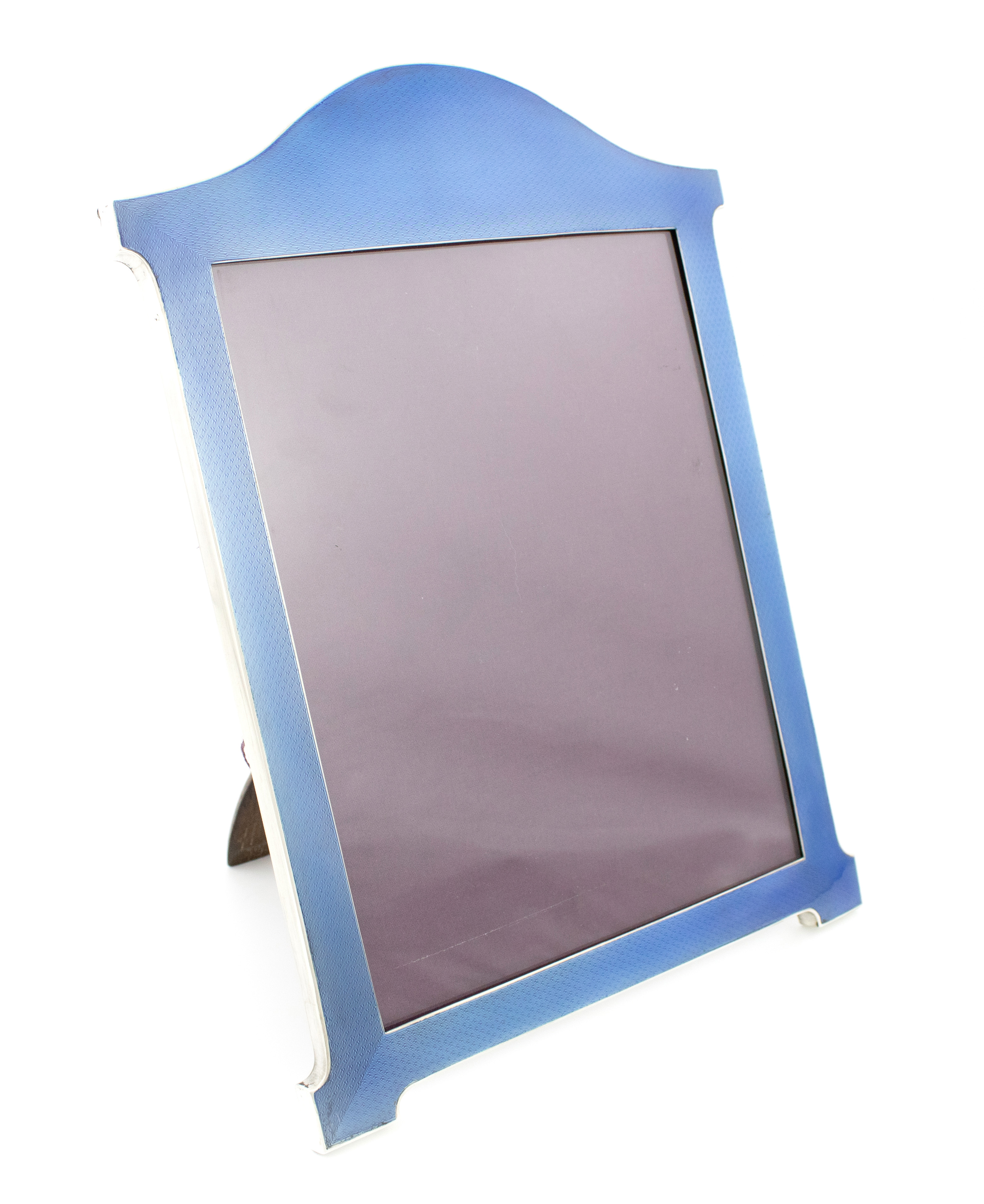 upright arched rectangular form, with later blue enamel decoration, wooden back and easel support, height 34cm.