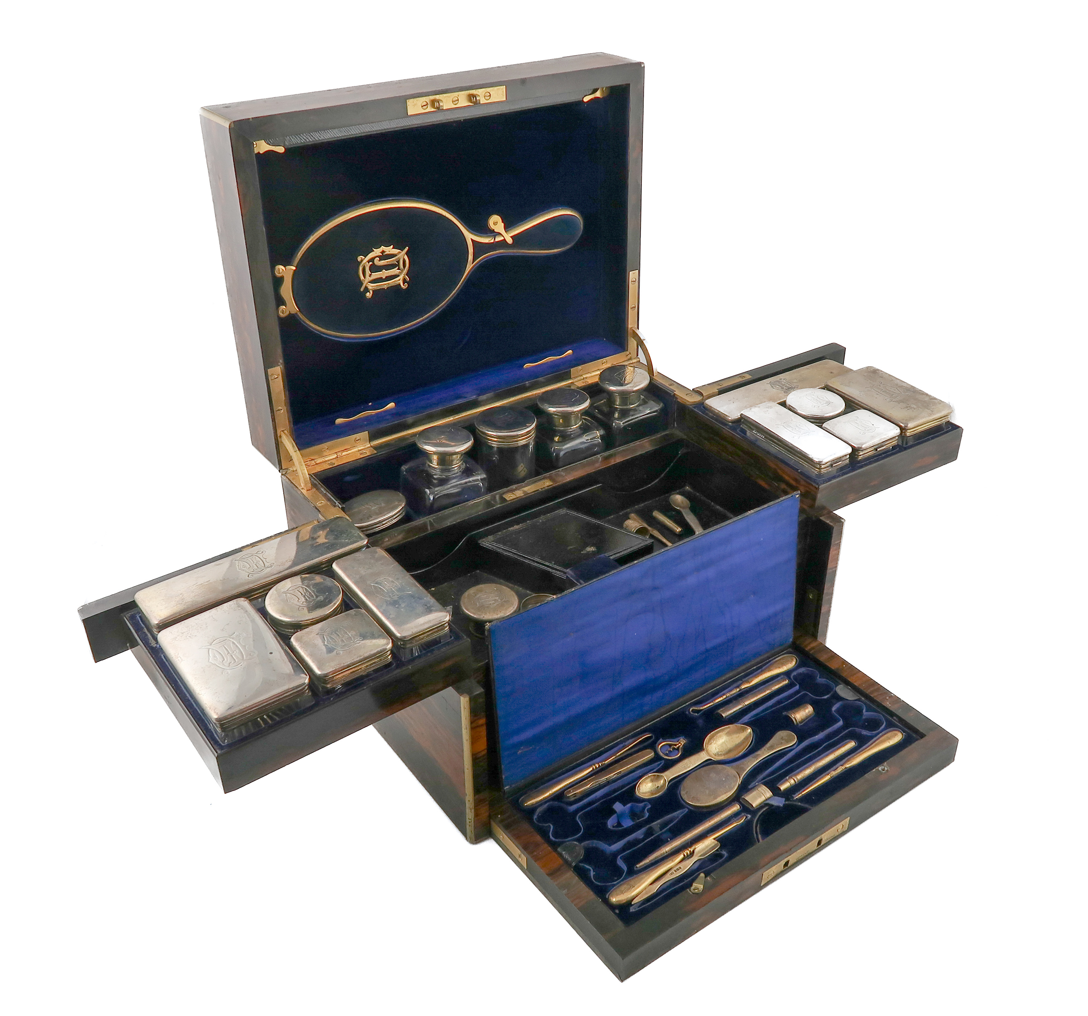 plain mounts, engraved with initials, clear glass bodies, some glass missing and some damaged, comprising: a travelling inkwell, a vesta box with striker, five toilet boxes, a circular jar, two circular toilet boxes, an oval jar and two mounts, the inside of the hinged cover set with a gilt mounted velvet mirror, glass a.f, and a stationary wallet, plus various implements including a dental mirror medicine spoon, a thimble, a penknife, a needle case, four manicure items with gilt-metal handles, a corkscrew and other items, in a fitted tray, plus a later medicine spoon, in a fitted brass-bound coromandel case, with a drawer and writing slope, initialled, length 37.5cm, approx. weighable 20oz.
