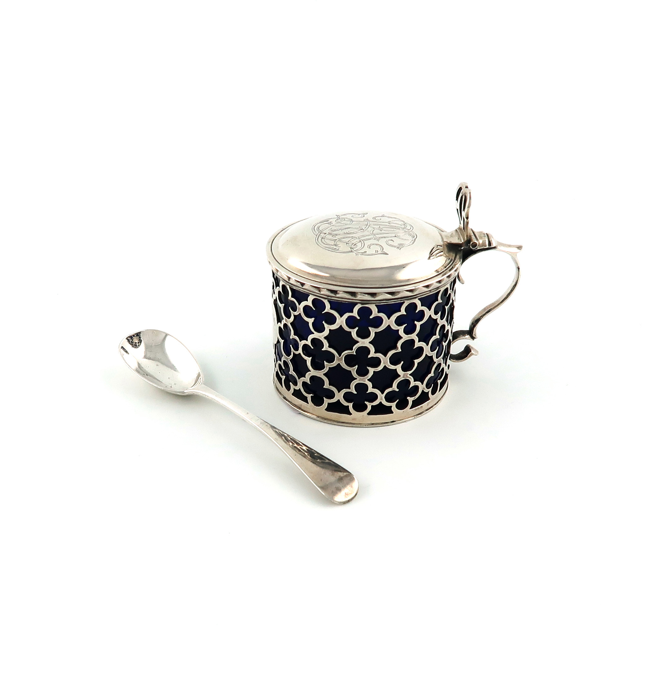 circular form, pierced quatrefoil decoration, hinged cover with engraved initials, scroll handle, blue glass liner, height 5.5cm, and a George IV silver Old English pattern mustard spoon, by Thomas & James Dicks, London 1821, approx. weight 2.8oz. (2)