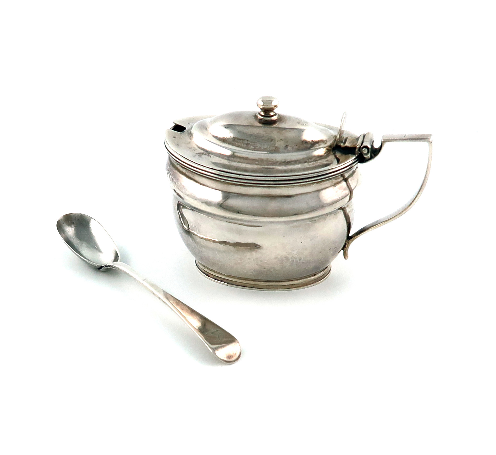 oval form, scroll handle, reeded border, hinged cover with a ball finial, blue glass liner, the underside inscribed 'Robert Andrew Esq.', height 6.1cm, and a George IV Old English pattern silver mustard spoon, by William Chawner II, London 1825, approx. weight 4.5oz. (2)