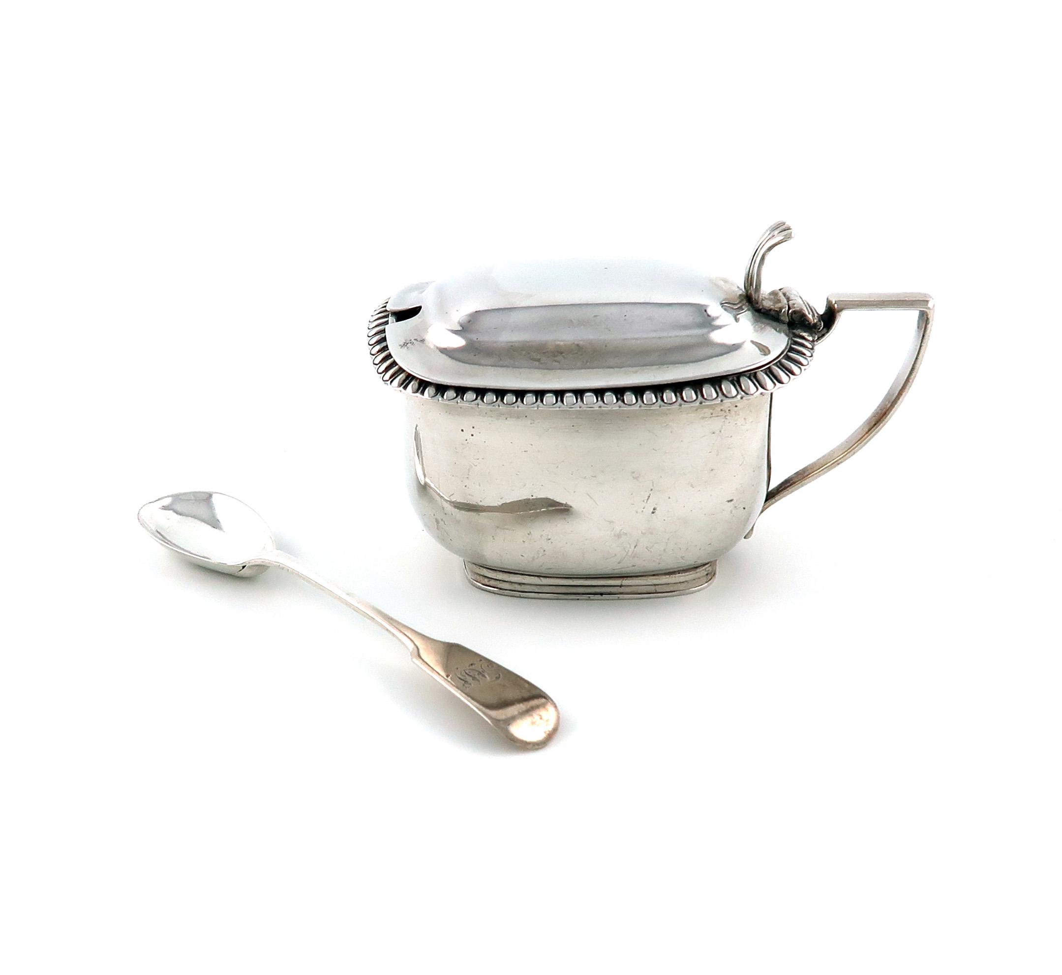 rounded rectangular form, gadrooned border, domed hinged cover, blue glass liner, scroll handle, on a rounded rectangular foot, height 6.1cm, and a George III Oar pattern silver mustard spoon, London 1804, approx. weight 5.2oz. (2)