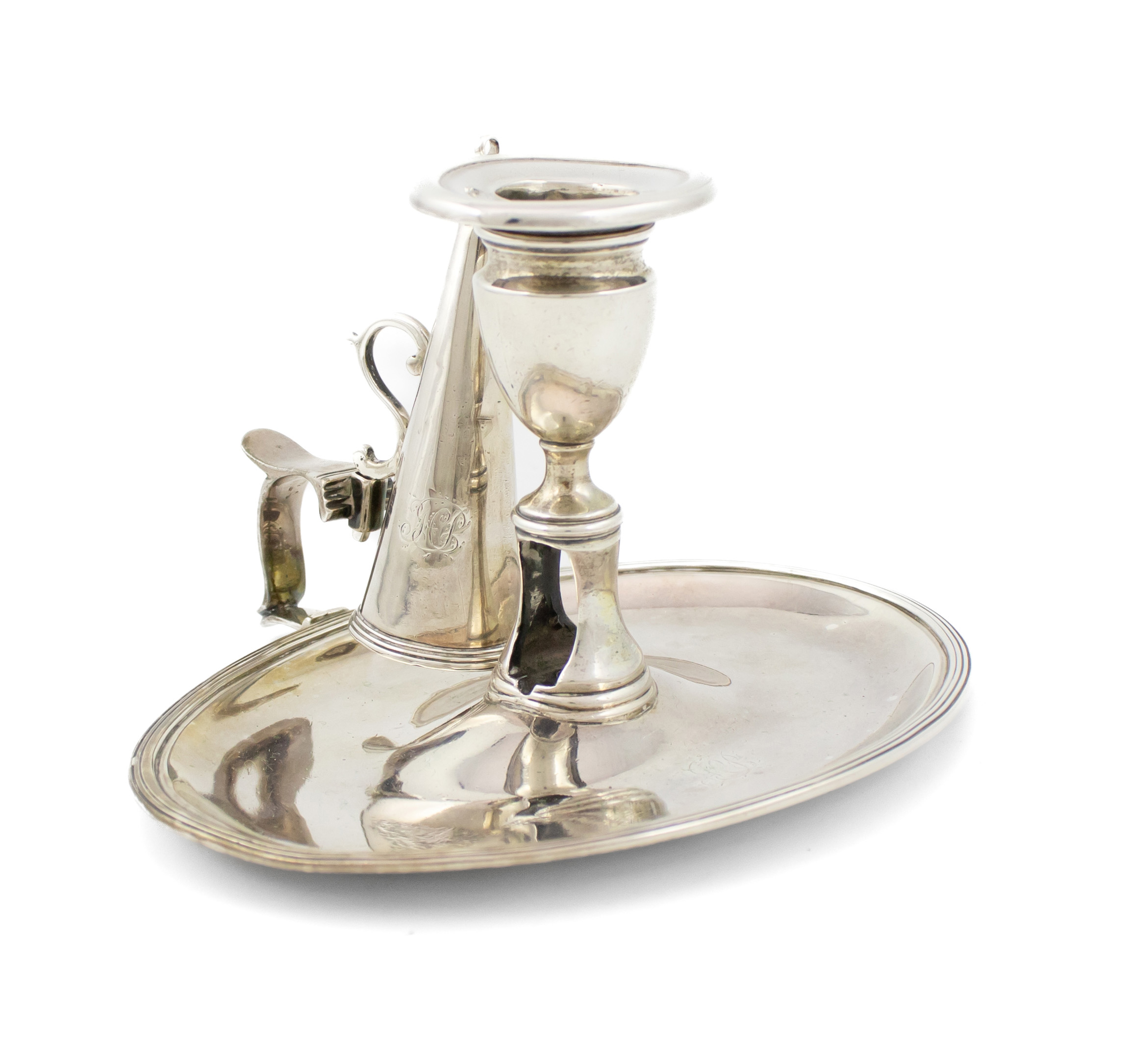 oval form, with a central pierced stem and urn-shaped capital, pull-off oval drip pan, scroll handle with detachable, conical snuffer, engraved initials to the base and suffer, length of the base 15.4cm, approx. weight 9.2oz.