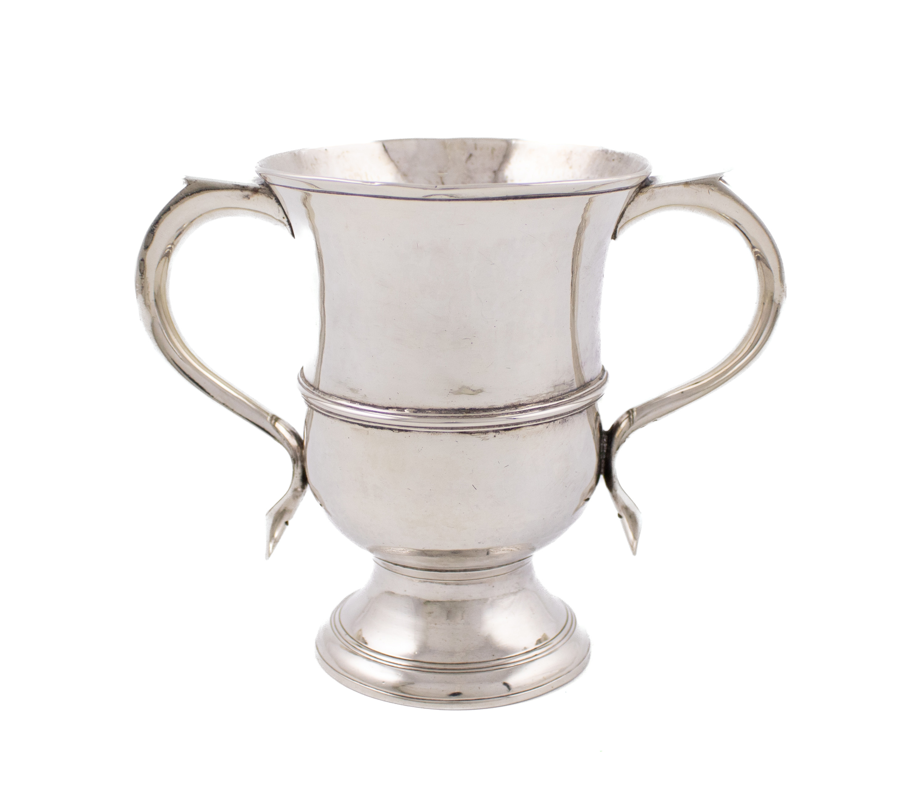 circular tapering form, scroll handles with scratched initials 'R' over 'WE', on a raised circular foot, height 13.2cm, approx. weight 10.3oz.