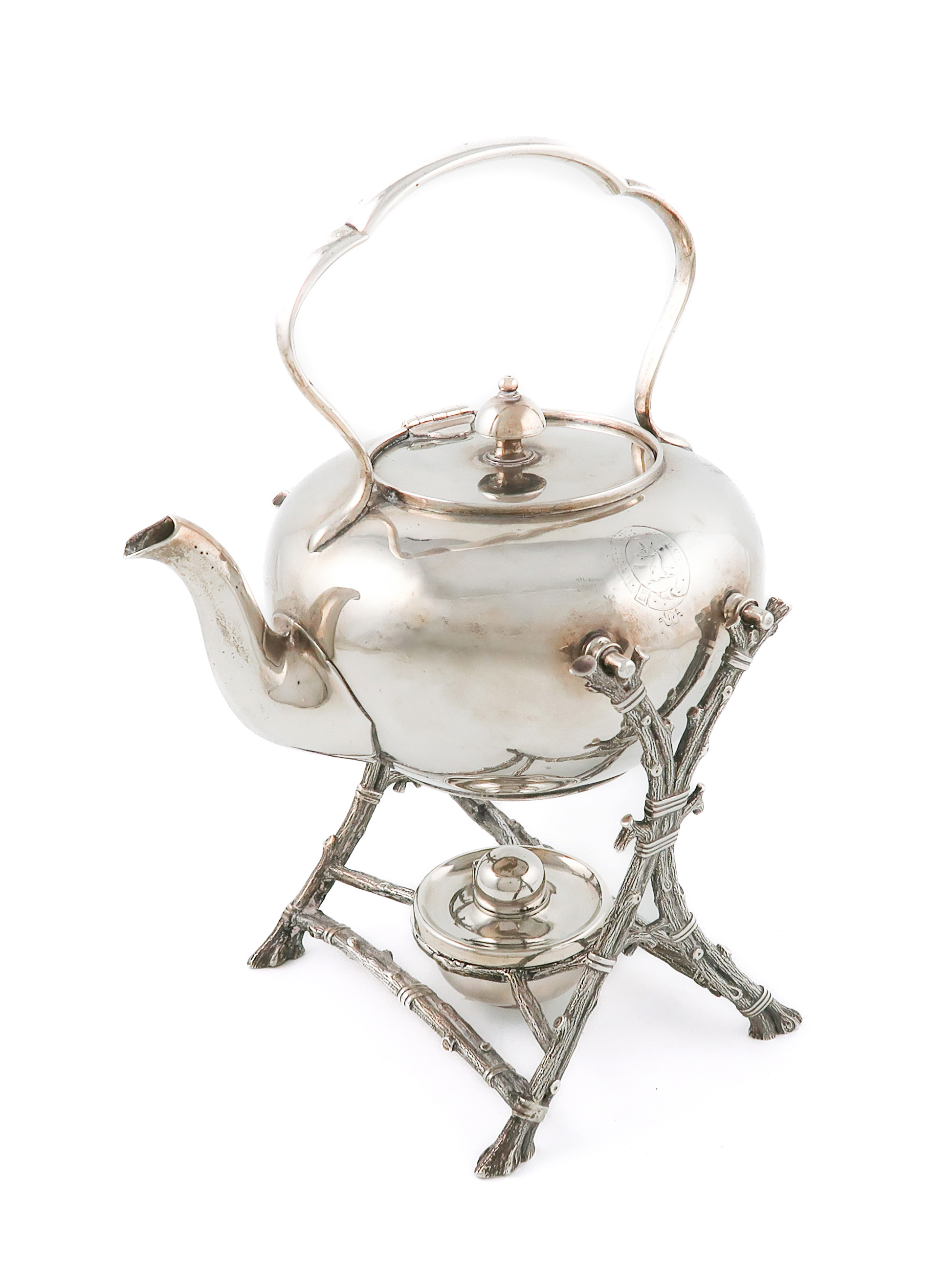 plain bullet form, central scroll handle, hinged cover with knop finial, with engraved crest and motto, the stand modelled as simulated bound branches, with a burner, height 27.9cm, total approx. weight 36.3oz.