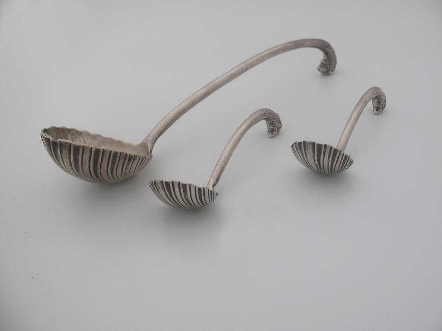 A George II soup ladle, and a pair of sauce ladles, with fluted circular bowls and hooked eagle mask terminals, the soup ladle engraved No.2, scratch weight 12-9 and initialled EW, maker Peter Taylor, London 1755, the sauce ladles unmarked, 16oz. (3)