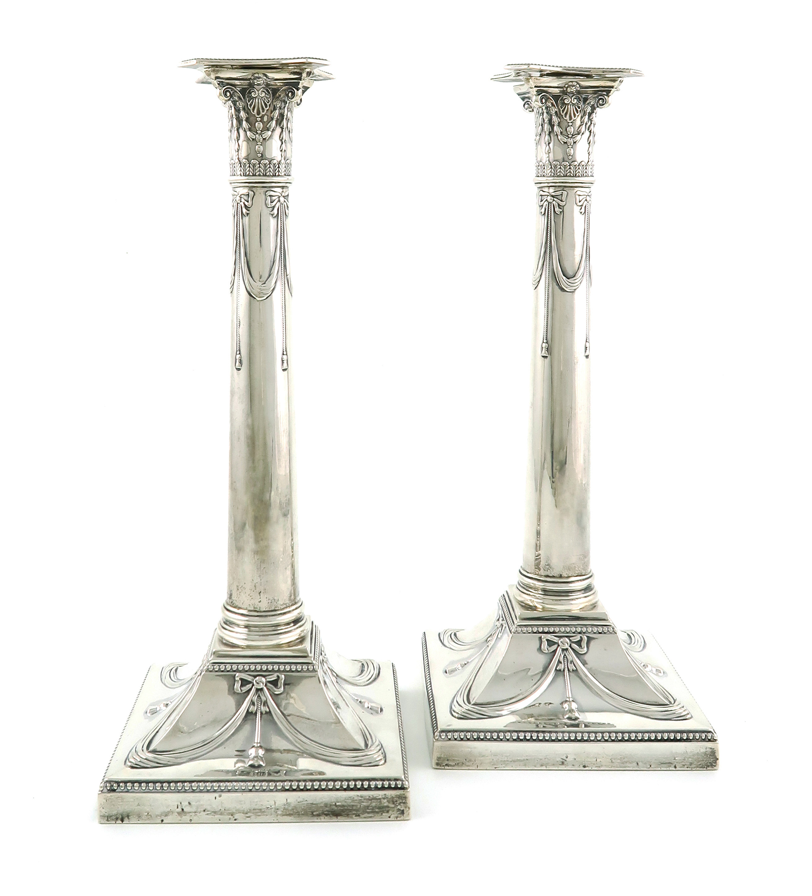 the columns with ribbon-tied swag decoration, removable drip pans, on raised squared bases, with beaded borders, height 30.8cm. (2)