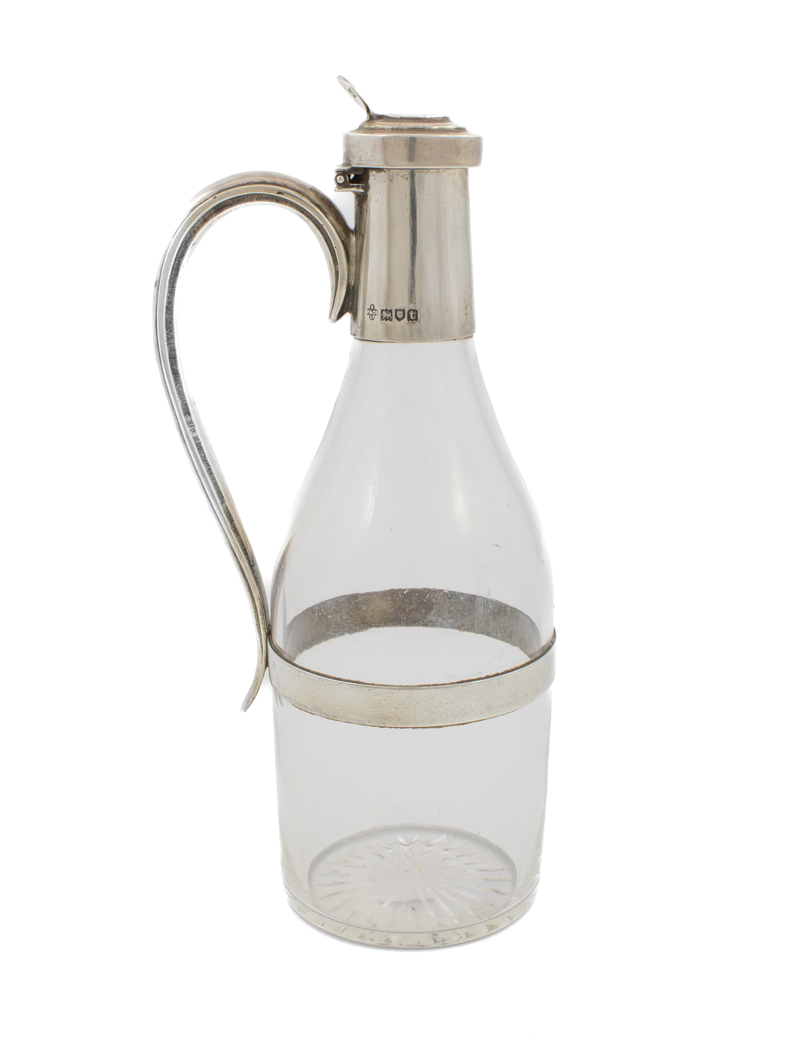 A silver-mounted glass oil/liqueur bottle,